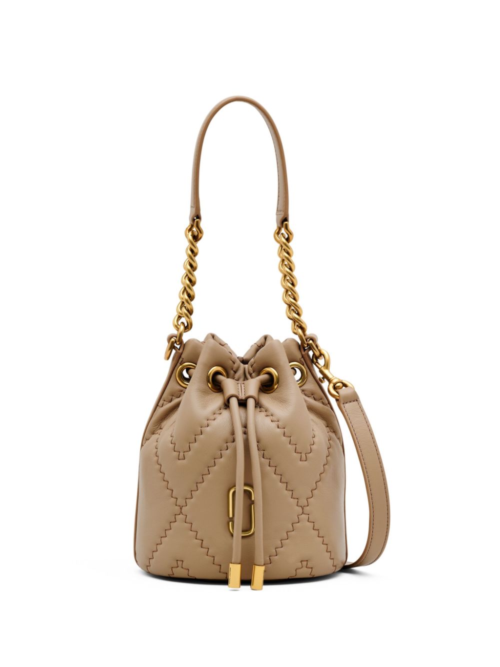 A signature style, The J Marc bucket bag by Marc Jacobs appears here in a light-brown iteration. Constructed with quilted leather, it features a monochromatic design elevated by the famous J Marc logo at the front.