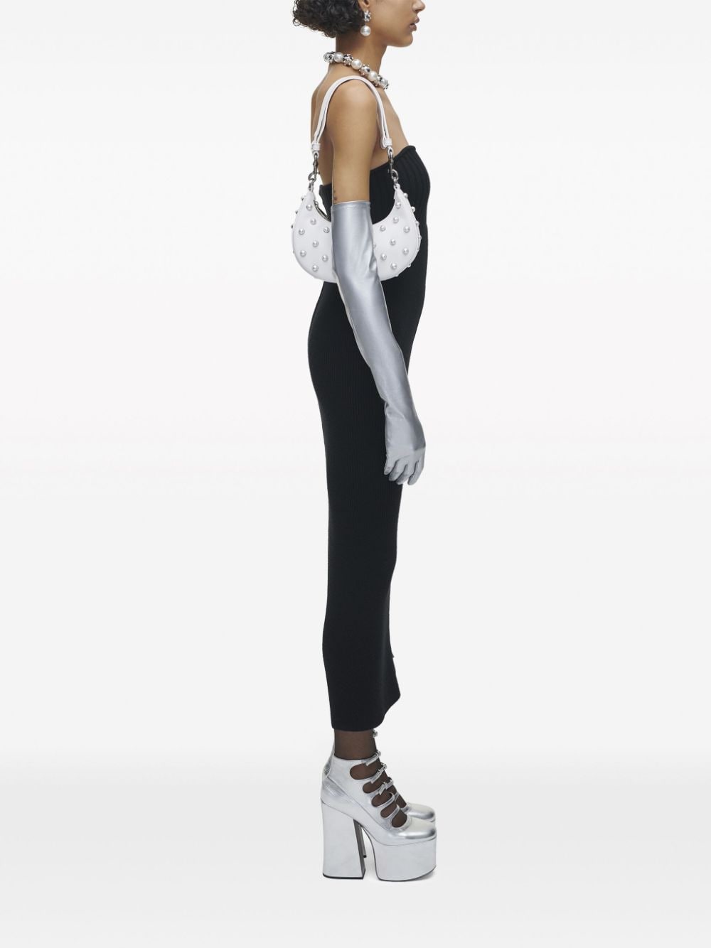 Fitted with both leather and chain-link straps that allow for multiple styling options, Marc Jacobs’ The Quilted Curve bag is rounded at the bottom for a soft silhouette. This smaller white iteration is punctuated with faux-pearls for an ornate look.