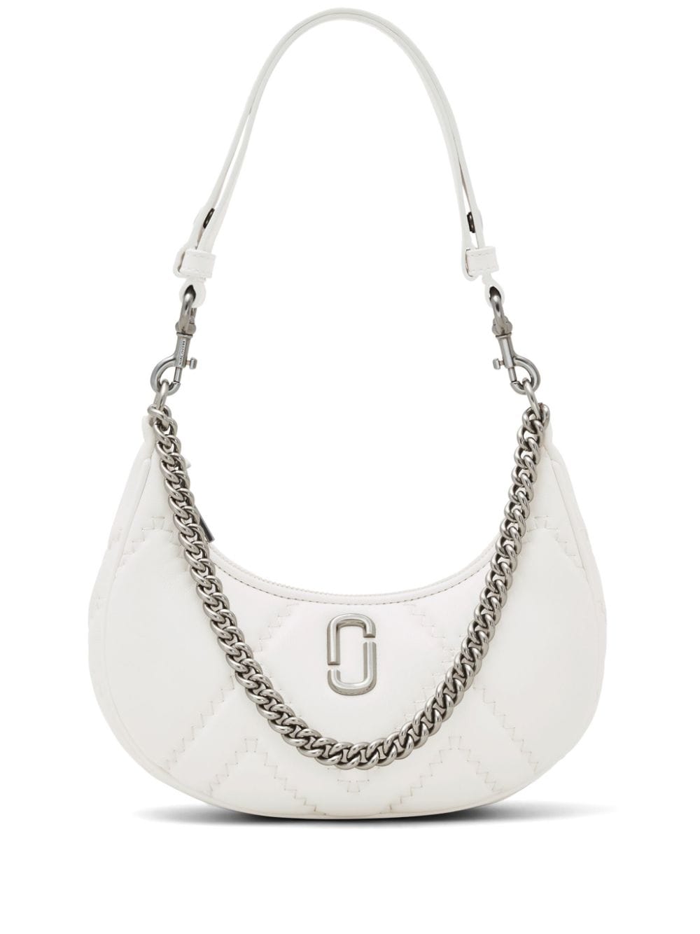 • The Quilted J Marc Curve bag from Marc Jacobs is so-called thanks to its rounded silhouette. This iteration is crafted from white leather with intricate stitching and a polished silver-tone logo plaque. The top handle and detachable chain-link strap allow for ample styling options.