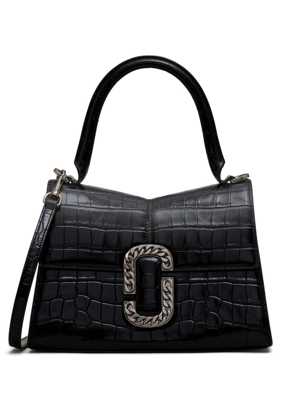 A signature style, The St. Marc tote bag by Marc Jacobs is back for the new season in a black colour. Crafted from croc-embossed leather, this model is defined by an ‘M’ shape adorned by a chain link J Marc hardware at the front.