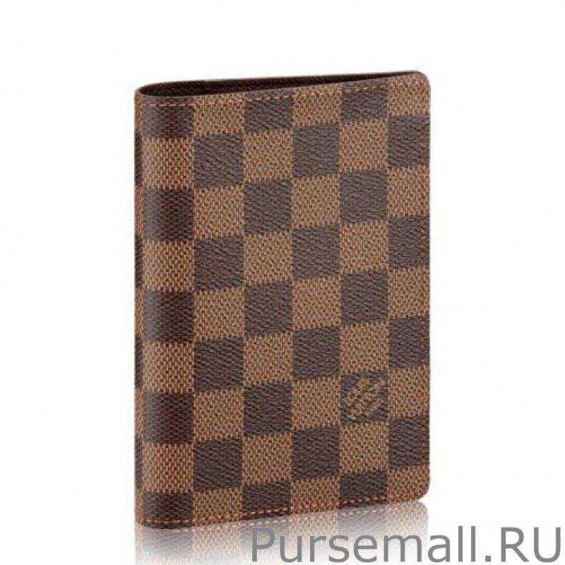 This passport holder in Damier canvas features various compartments to hold business cards and papers.