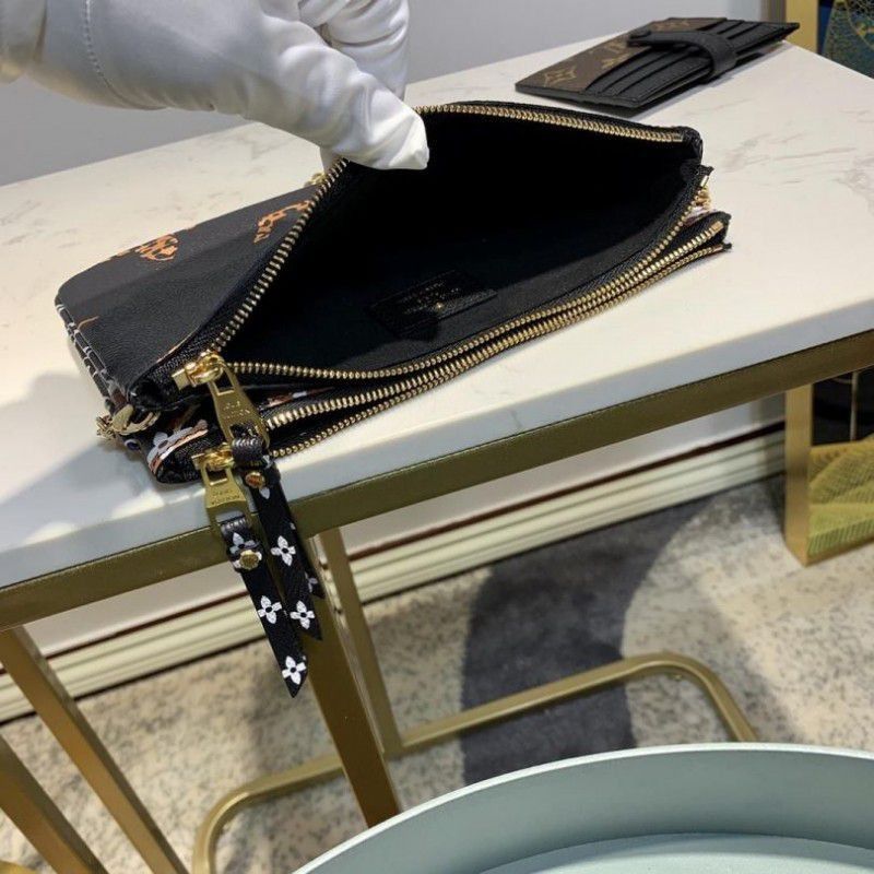the Pochette Double Zip comes in Monogram and Monogram Giant canvas with a graphic animal print. This pouch offers two zipped pockets for valuables and a middle space for easy access to essentials. It can be carried on the shoulder, across the body or in the hand