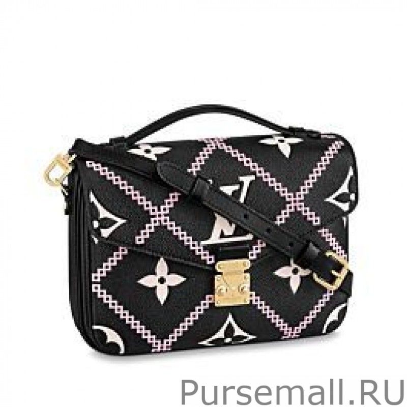 For Spring 2022 the Pochette Metis handbag in Monogram Empreinte leather is embellished with embroidery inspired by the quilted linings of original Louis Vuitton trunks. House craftsmanship shines in the colors and te x tures of the stitching against a background of embossed leather. This versatile statement piece features a convenient top handle and a removable crossbody strap.