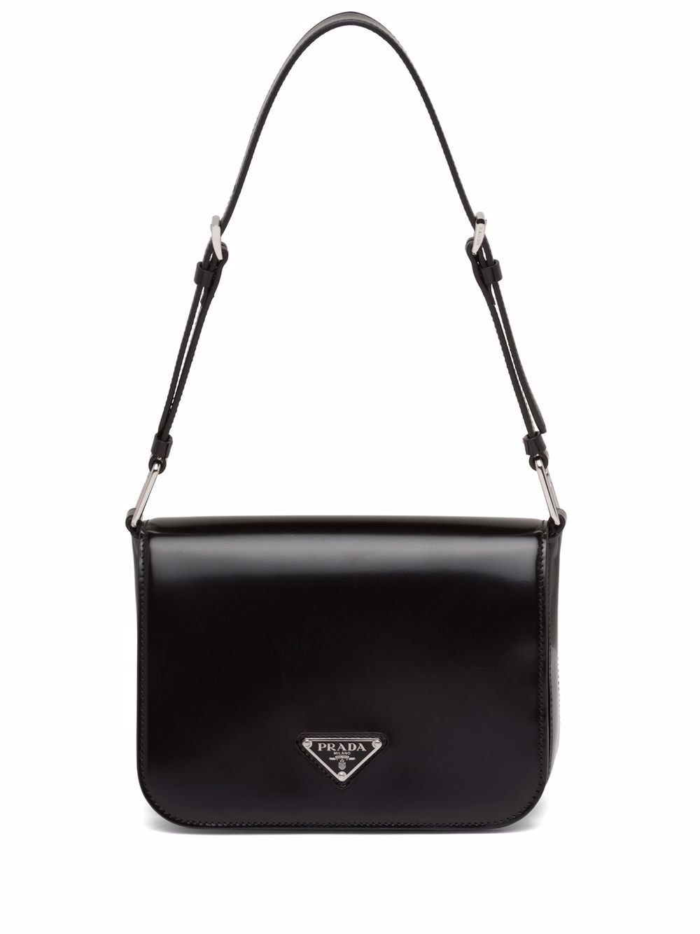 Prada’s iconic enamel triangle logo is seen throughout its most recent collections, adding a signature touch to each design. Crafted from brushed leather, this sleek black shoulder bag is detailed with two logo-engraved buckle fastenings.