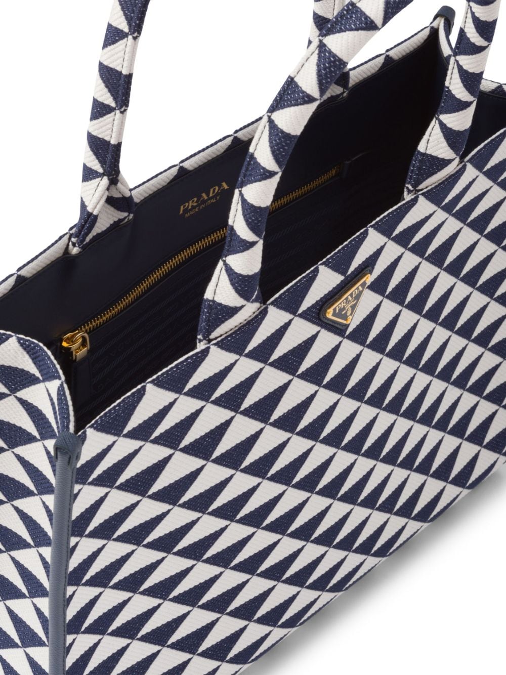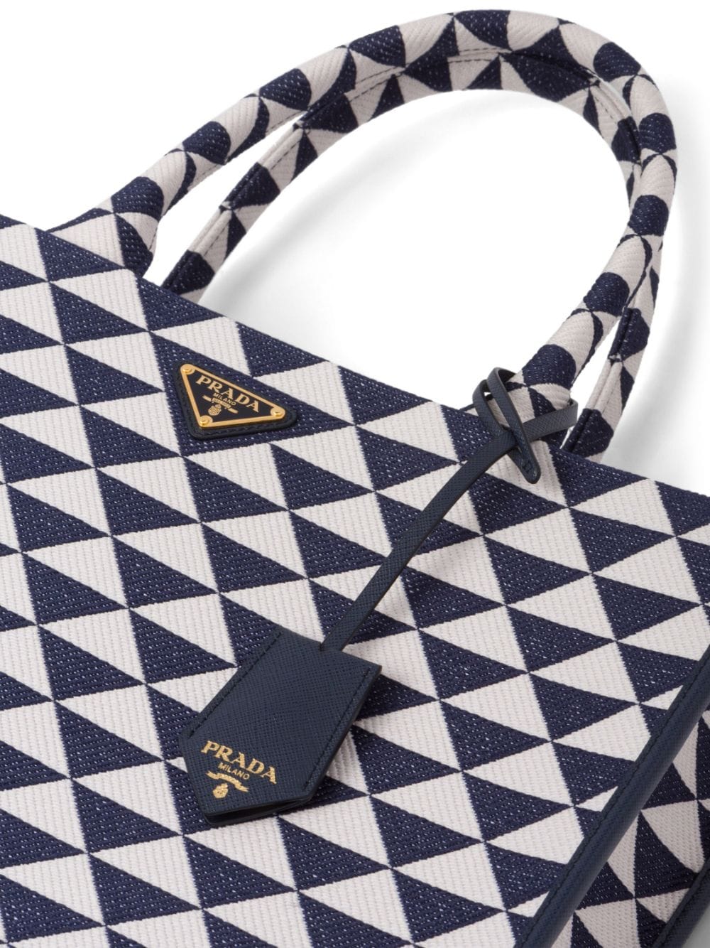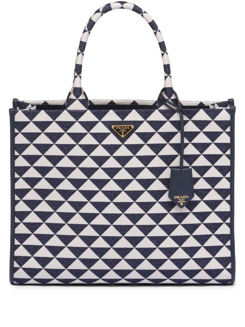This tote bag has the iconic enameled metal triangle logo to the front of this design, a motif that first appeared in 1913 on trunks designed by Mario Prada.