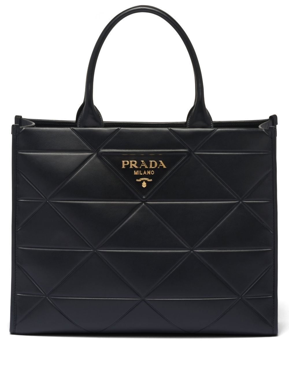 Characterised by the geometric-shaped motif that echoes the emblematic triangle logo of the brand, this leather tote bag is unmistakably Prada. The spacious design is completed by gold-tone logo lettering to the front for an extra branded finish.