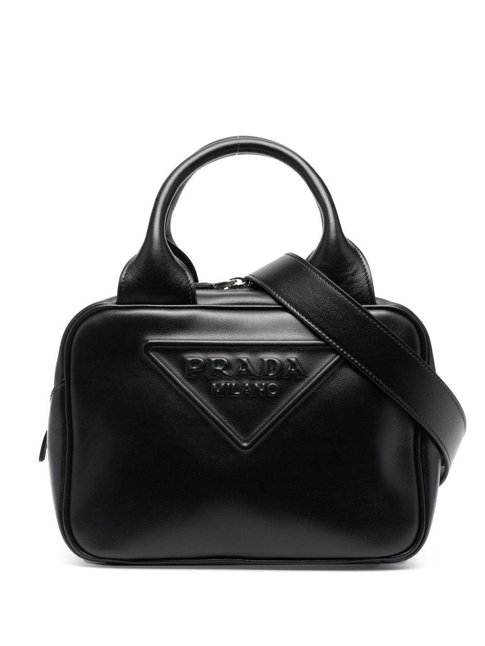 Prada solidifies the importance of its iconic triangular emblem in this leather tote bag design. Crafted from smooth black calf leather in a carryable rectangular shape, the petite tote bag offers the brand’s signature motif in its classic enamel plaque form and subtle embossed technique.