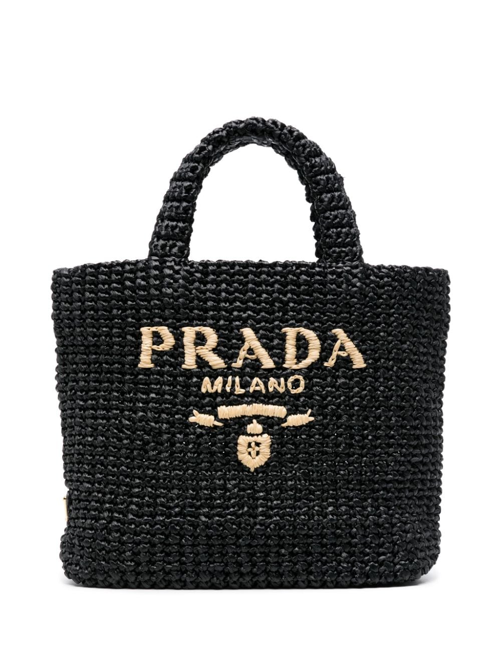 Woven with black straw, this tote bag exemplifies Prada’s meticulous craftsmanship. The design is accented with a contrasting logo on the front, adding a recognisable touch to the spacious piece.