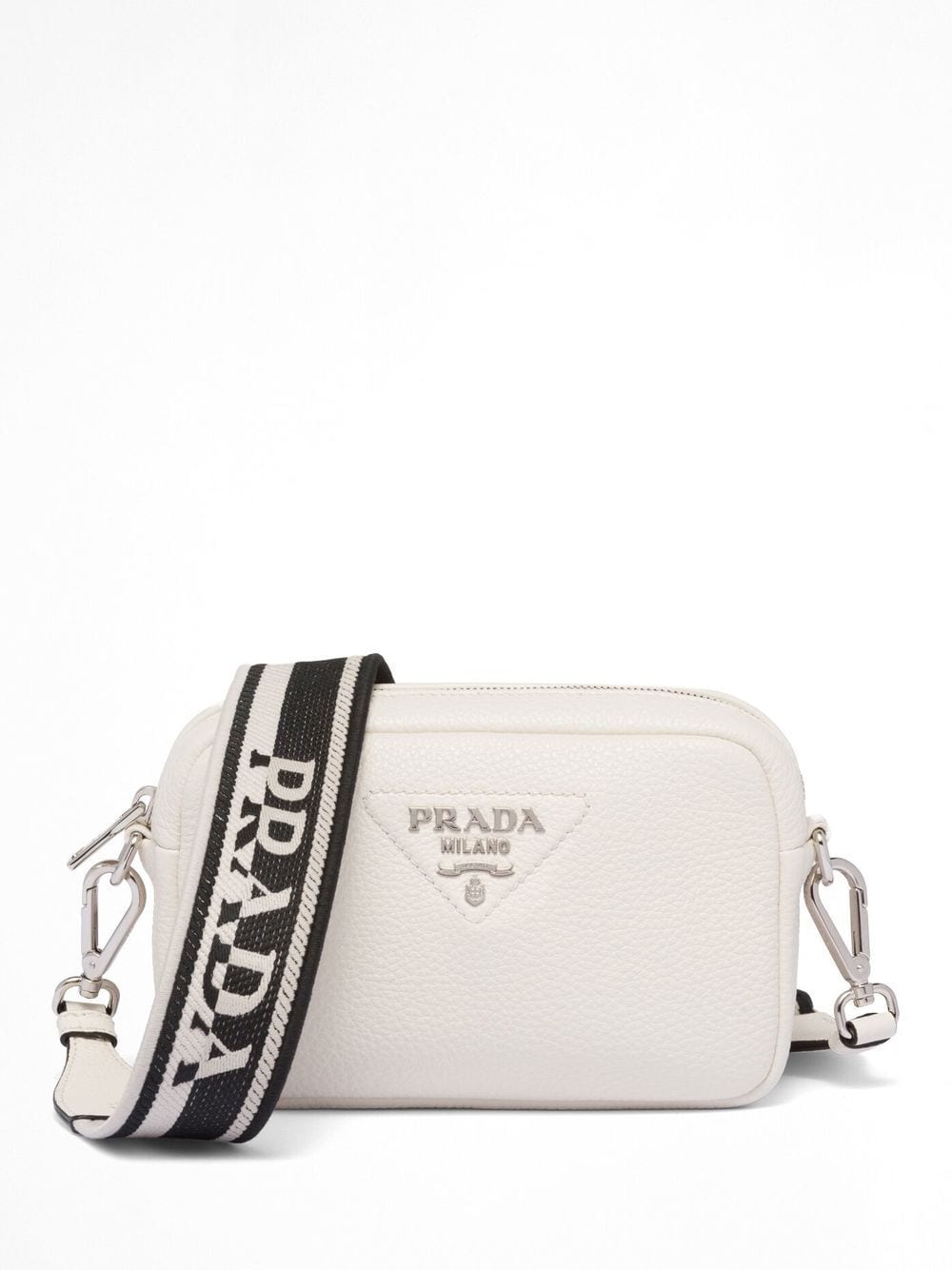logo-plaque crossbody bag from PRADA featuring off-white, leather, grained texture, triangle logo, silver-tone hardware, top zip fastening and adjustable detachable shoulder strap.