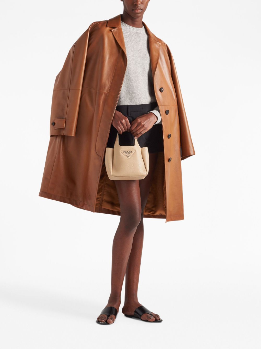 Prada’s tote bag spotlights the band’s signature triangle motif. Crafted from leather, this ‘Sand’ beige iteration is topped with the brand’s triangle logo at the centre.