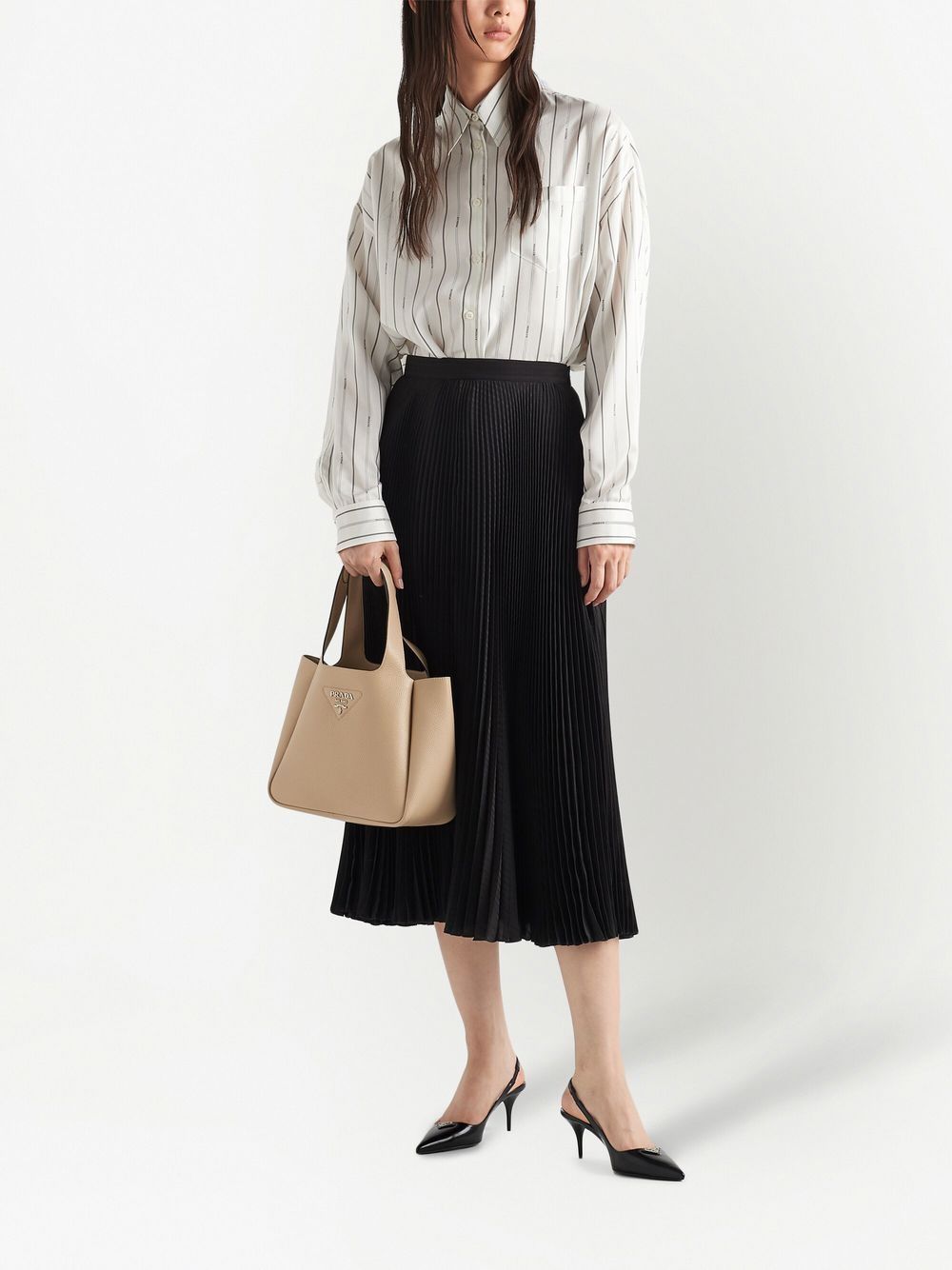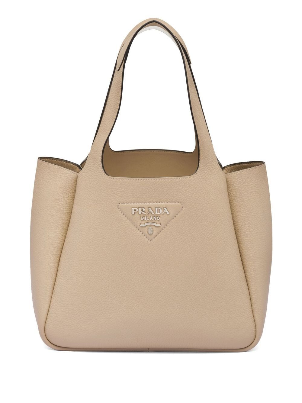 Made in Italy from supple Nappa leather worked into a pebbled texture, this sand beige tote from Prada is defined by its slouchy silhouette and spacious main compartment. A silver-tone logo plaque adds a recognisable touch to its understated exterior.