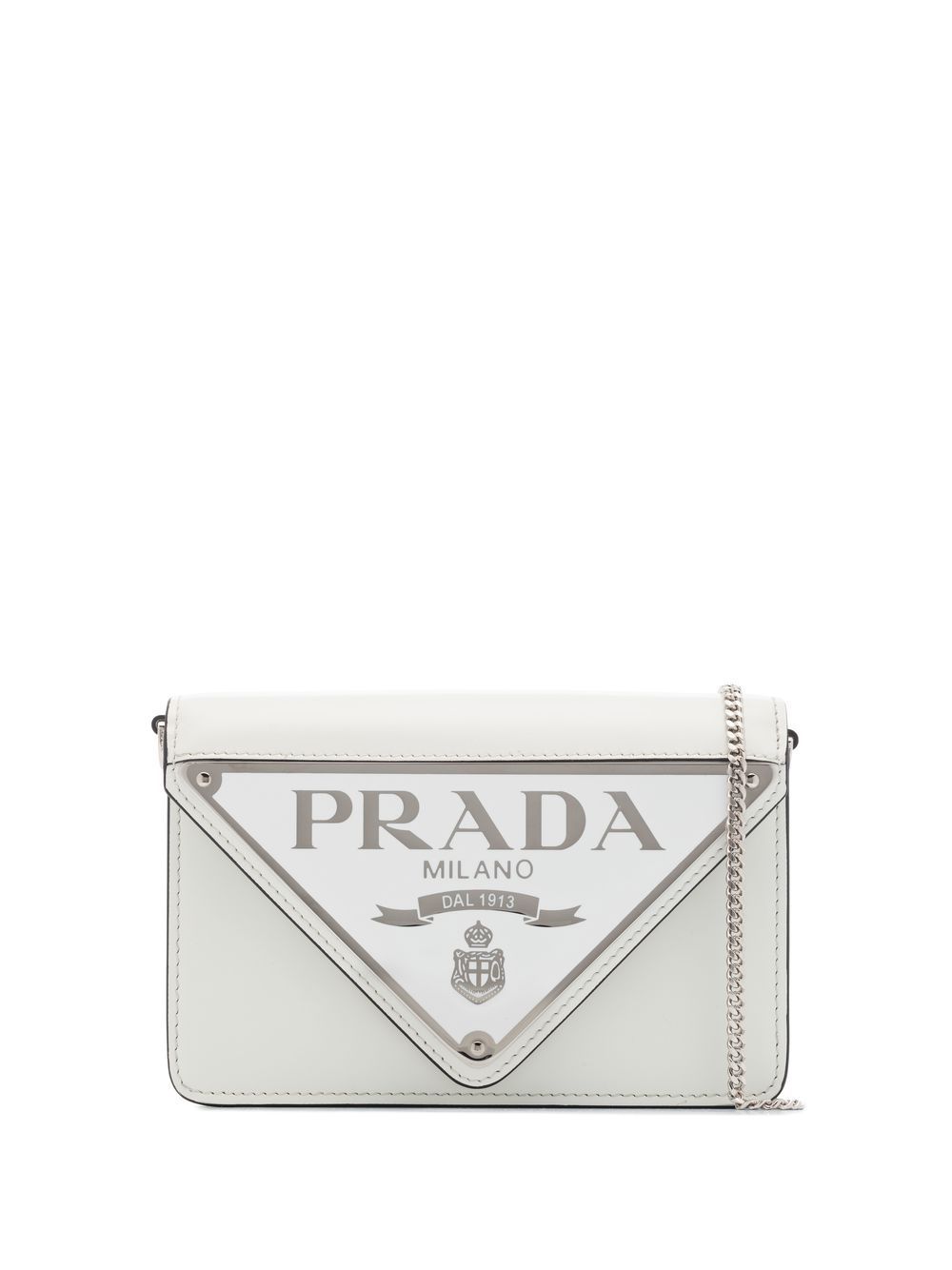 Prada’s shoulder bag spotlights the brand’s iconic triangular logo. Here, the emblem decorates the foldover flap and the sliding drawstring on the detachable shoulder strap.