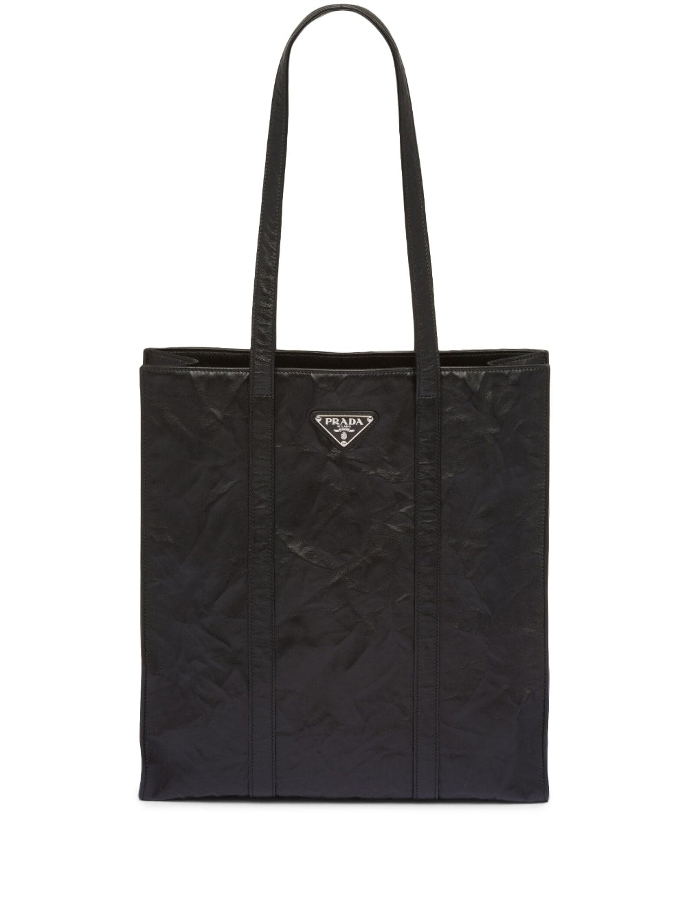 nappa-leather tote bag from PRADA featuring black, lambskin, enamel triangle logo, internal logo plaque, open top, two top handles, main compartment and internal zip-fastening pocket.