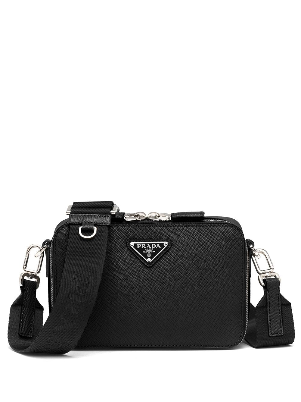 Versatility at its finest. Crafted from saffiano leather, this black messenger bag comes with an adjustable detachable shoulder strap and a removable pouch. Thanks, Prada.