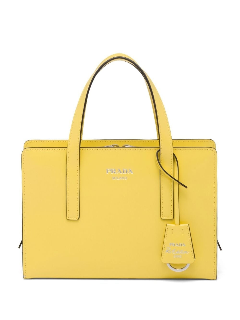 Re-Edition 1995 leather mini bag from PRADA featuring yellow, leather, silver-tone logo lettering, logo tag, internal logo plaque, two top handles, adjustable detachable shoulder strap, partitioned compartment and zip-fastening compartment.