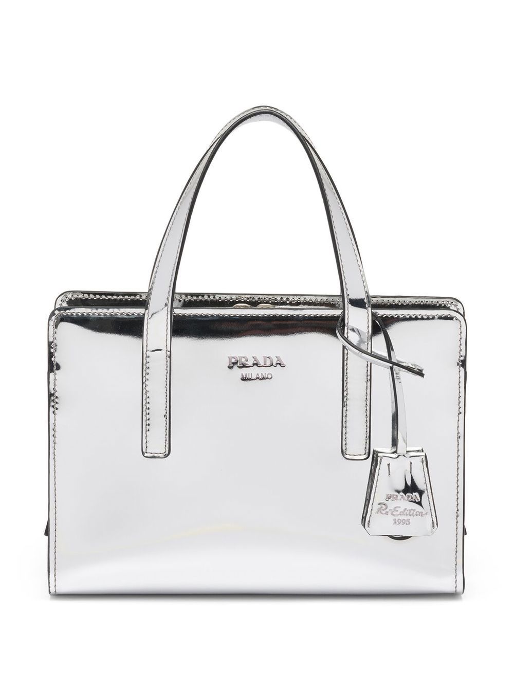 Re-Edition 1995 metallic tote bag from PRADA featuring silver-tone, leather, metallic finish, logo print to the front, logo tag, two top handles, partitioned compartment, logo-print lining and zip-fastening compartment.