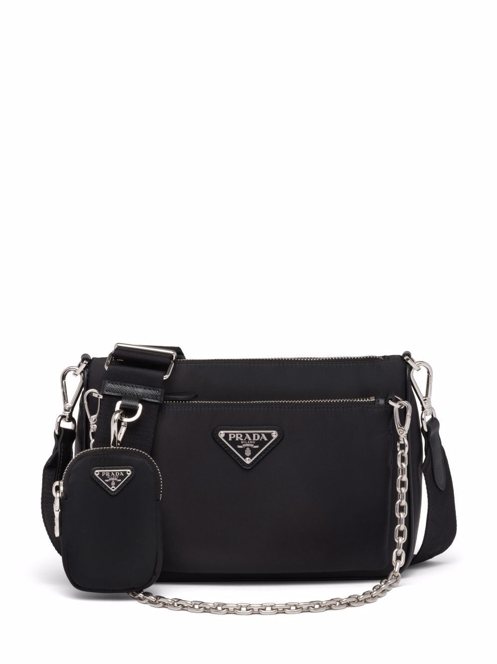 Practicality meets sleek style with the introduction of this black shoulder bag from Prada. The accessory boasts two detachable main pockets and a small zip-fastening pocket. Made from recycled nylon, the design is punctuated with silver-tone hardware and the house’s signature triangle logo.