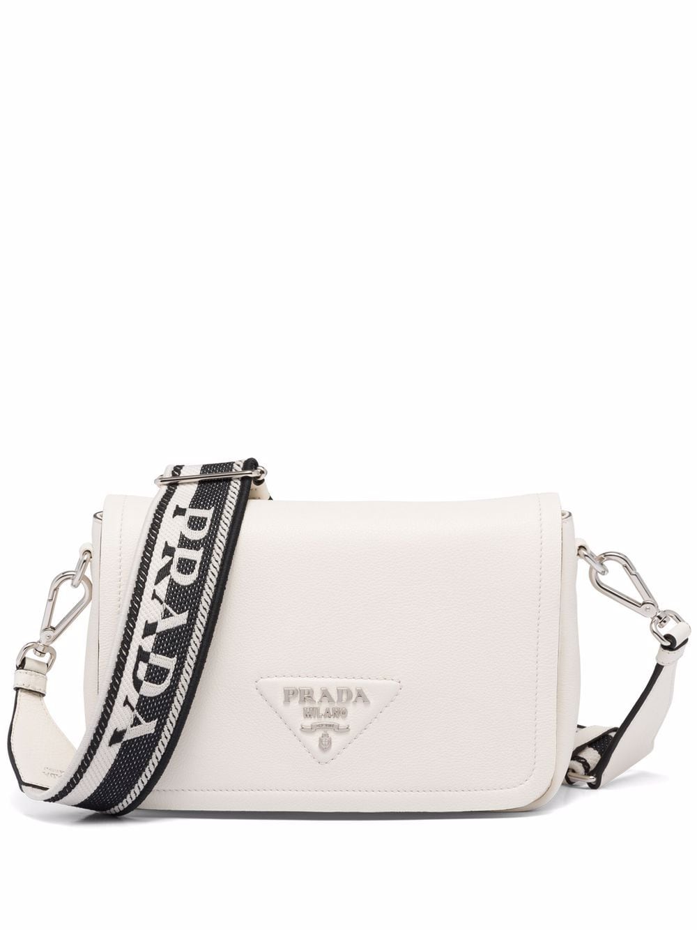 Prada’s triangular logo plaque is an iconic motif for the brand that transcends seasons thanks to its traditional shape and refined lettering. Crafted from leather in a timeless white tone, this modern silhouette is decorated with the silver-tone lettering logo on the flap and finished with an embroidered logo shoulder strap.