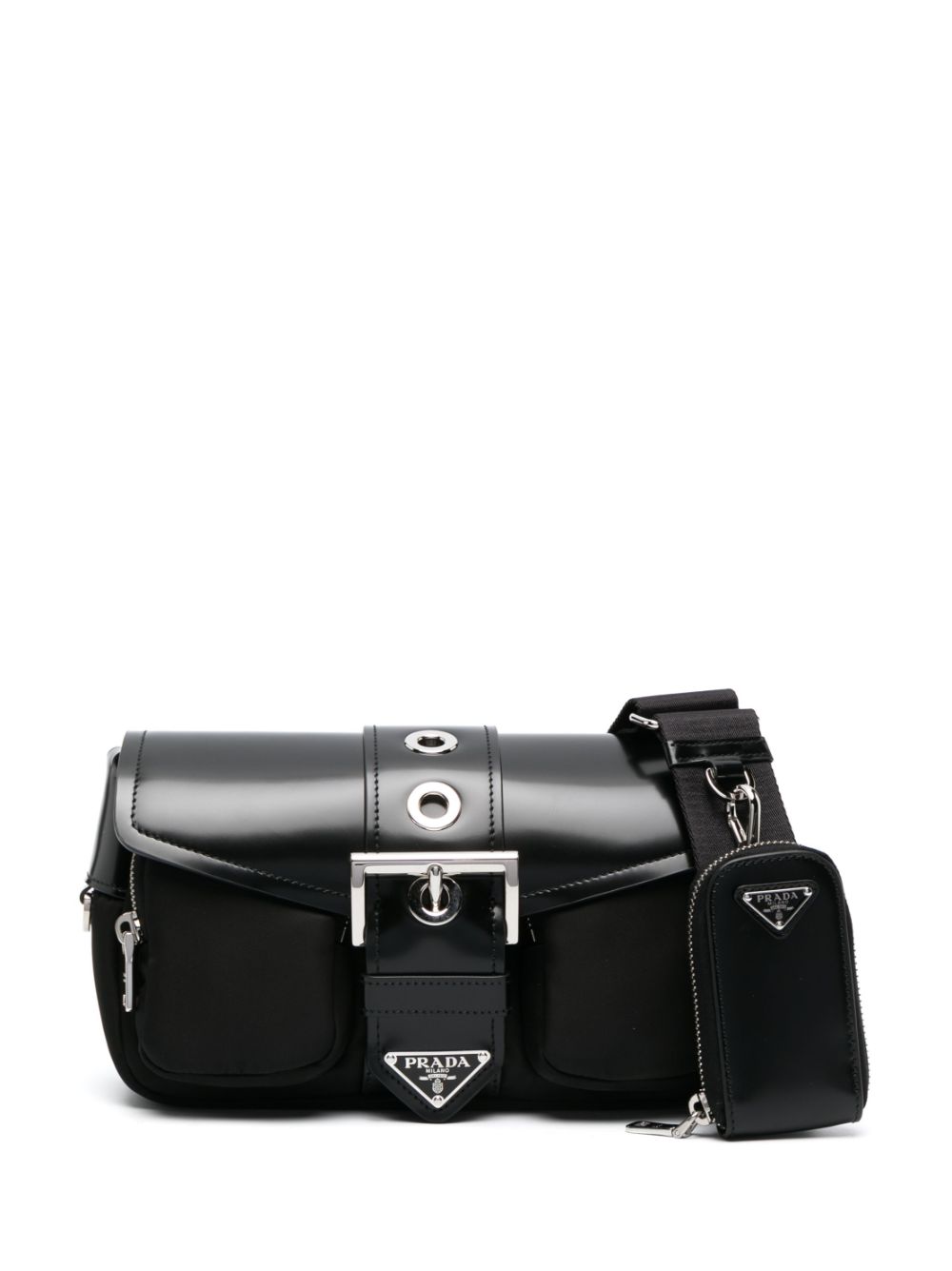 Prada’s enduring house codes are celebrated with this small Pocket shoulder bag. It’s crafted from panels of signature Re-Nylon and leather to a boxy silhouette. The shoulder strap is adorned with a detachable pouch and silver-tone Triangle hardware adds branded completion.