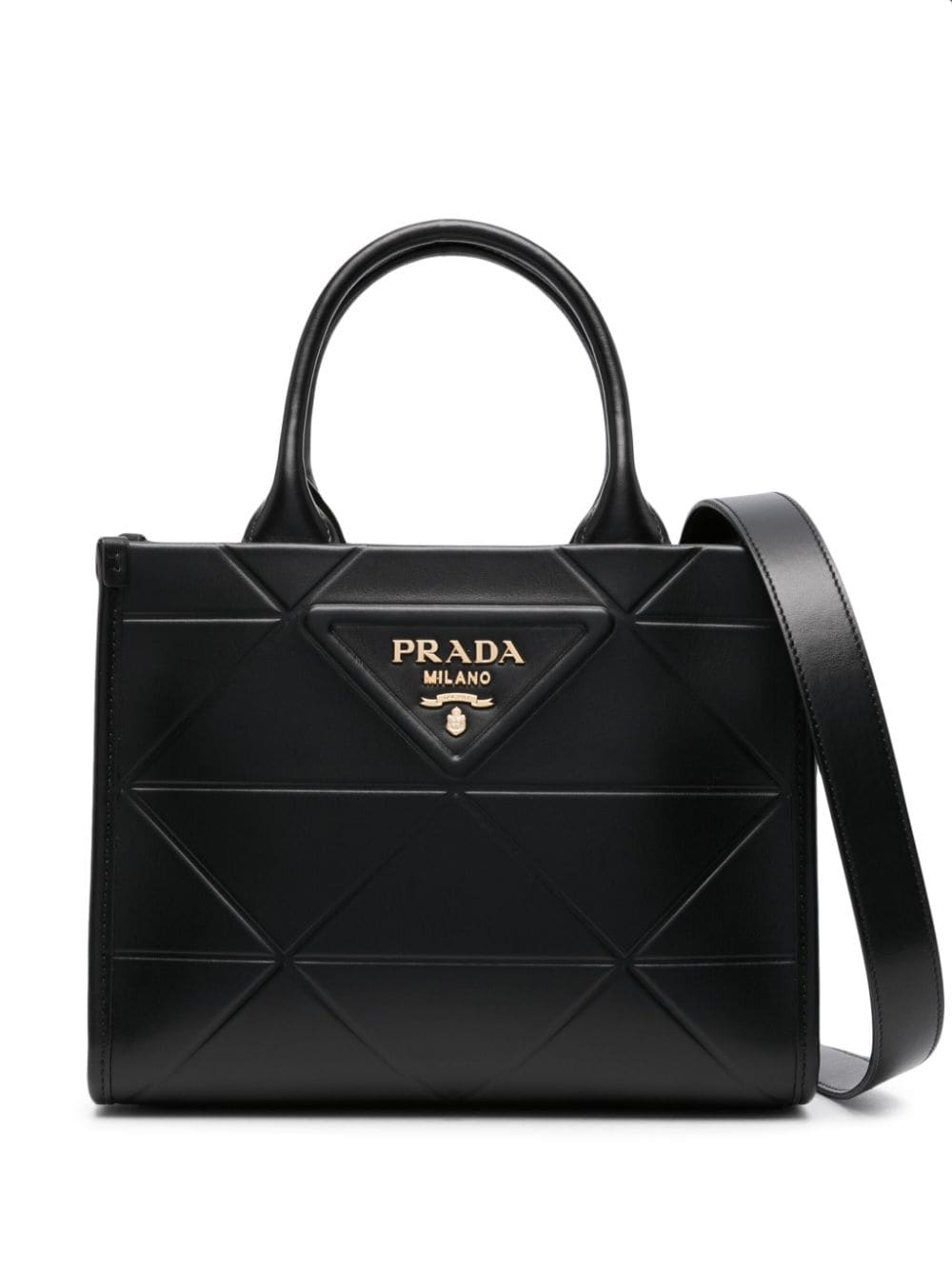 Originally found in trunks designed by Mario Prada, the triangle has become synonymous with the Italian house. Here, it’s stitched onto this Prada Symbole tote bag in a tonal colourway. Gold-tone logo lettering adorns the front.