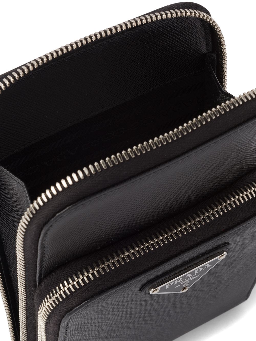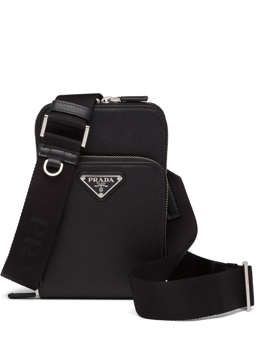• Crafted in the brand’s iconic Saffiano leather, Prada’s mini bag is presented in a timeless black colourway. Featuring a detachable and adjustable shoulder strap, the piece boasts the signature enamel triangle logo in polished silver-tone hardware.