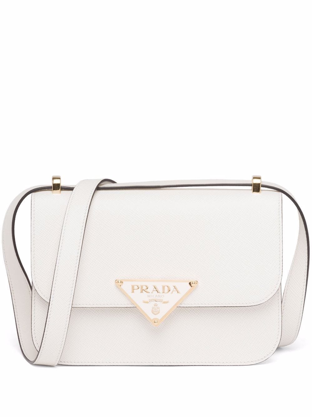 Italian-made, Prada’s sleek crossbody bag is fabricated from white leather with complementary gold-tone hardware. Detailed with a triangle logo plaque to the front, the accessory honours one of the label’s most recognisable symbols.