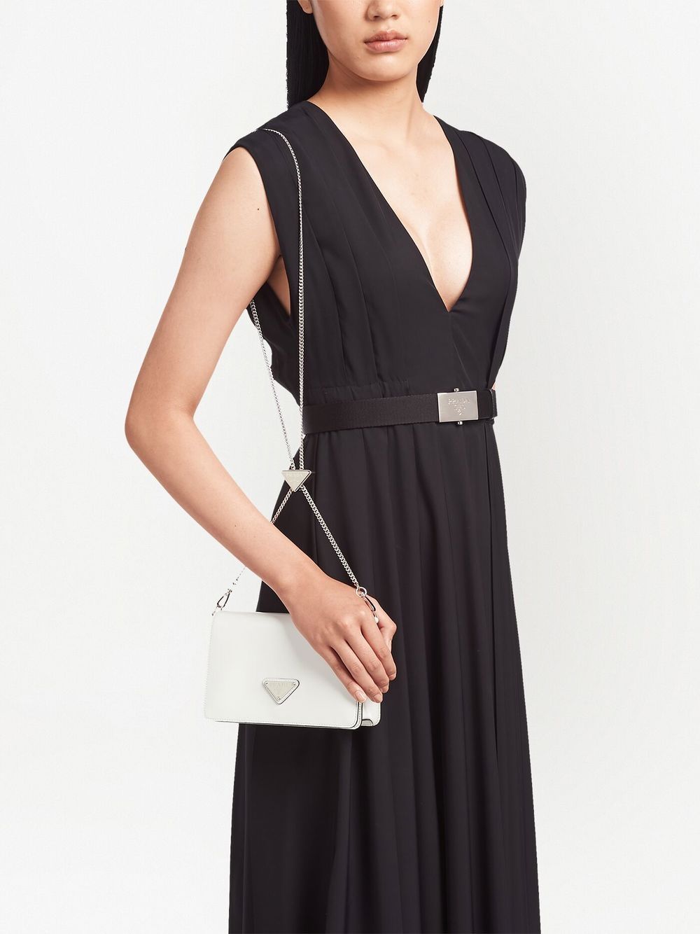• triangle-logo small shoulder bag from PRADA featuring white, leather, enamel triangle logo, detachable chain-link shoulder strap, adjustable-length chain, foldover top with magnetic fastening, main compartment and internal zip-fastening pocket.