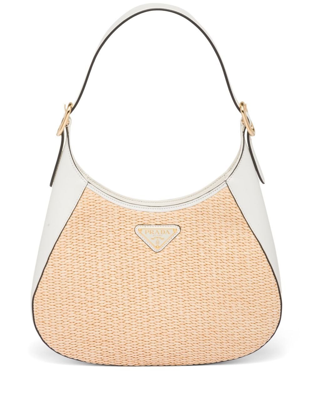 Prada’s signature enamel triangle logo sits to the face of the woven straw exterior of this shoulder bag as smooth leather brings contrast to the design. Complete with an adjustable shoulder strap and a concealed magnetic fastening.
