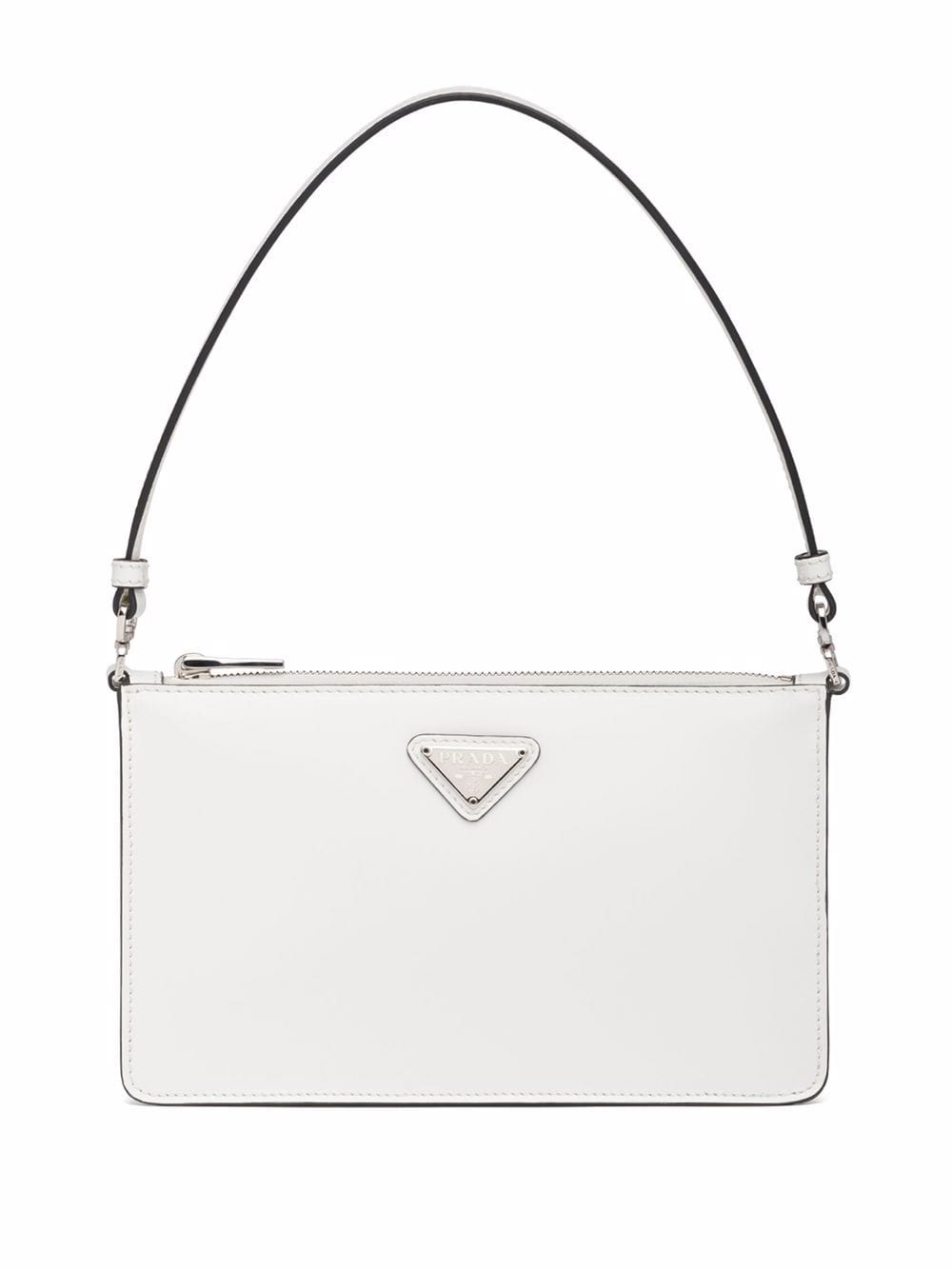 Prada’s mini-sized shoulder bag is dressed in white leather and features the label’s signature triangle logo plaque, which came to fruition in the 1970s.