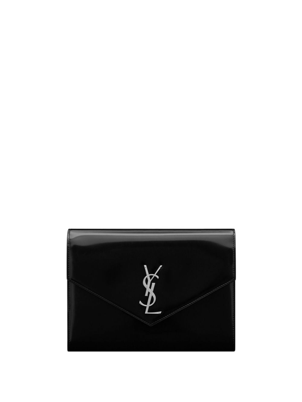 Uniting two brand icons, Saint Laurent presents this black clutch bag. Crafted from glossy calf leather, it boasts a signature envelope design that is equally sleek and practical. It is punctuated with the brand’s iconic Cassandre logo, designed in 1961 by Adolphe Jean Marie Mouron under his pseudonym, which gives the layered symbol its name.