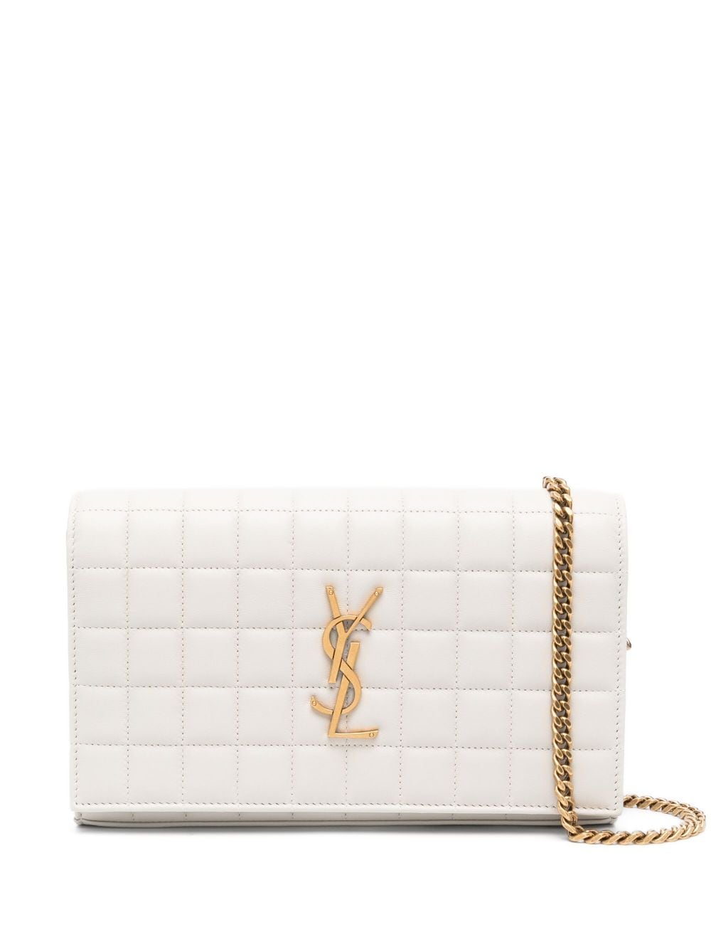• Quilted in matelassé with a grid pattern, this Saint Laurent clutch demonstrates the brand’s perfect fusion of timeless and contemporary. The leather accessory is elevated by its refined gold-tone hardware, including an iconic Cassandre plaque on the front.