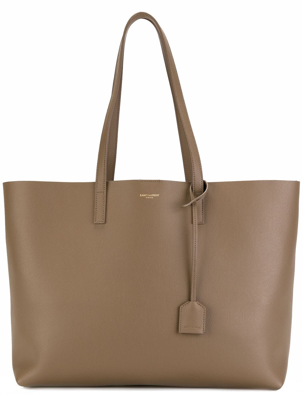 • If you’re the kind of girl who doesn’t know how to pack light, this one is for you. Crafted from leather, this taupe brown E/W Shopping tote bag from Saint Laurent has enough space to carry everything but the kitchen sink – in great style. Go big or go home. Featuring top handles, a front centre logo stamp, a snap button closure, a main internal compartment, a removable pouch, a hanging key fob and gold-tone hardware.
