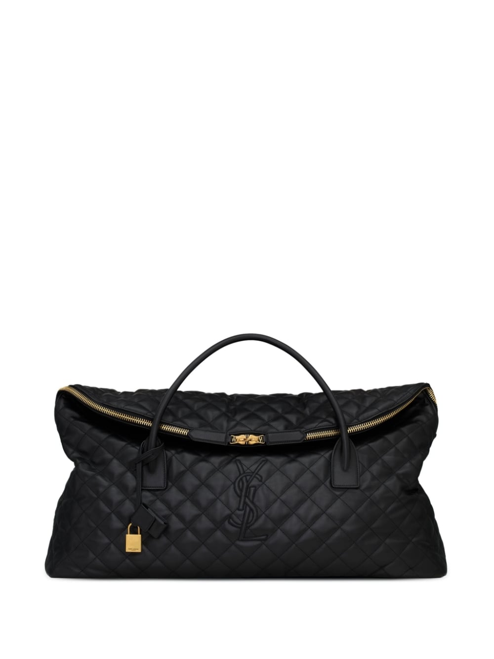 This Saint Laurent maxi duffle bag is crafted from black calf leather and detailed with diamond quilting all over. An engraved gold-tone padlock and embossed logo lettering at the front add signature touches.