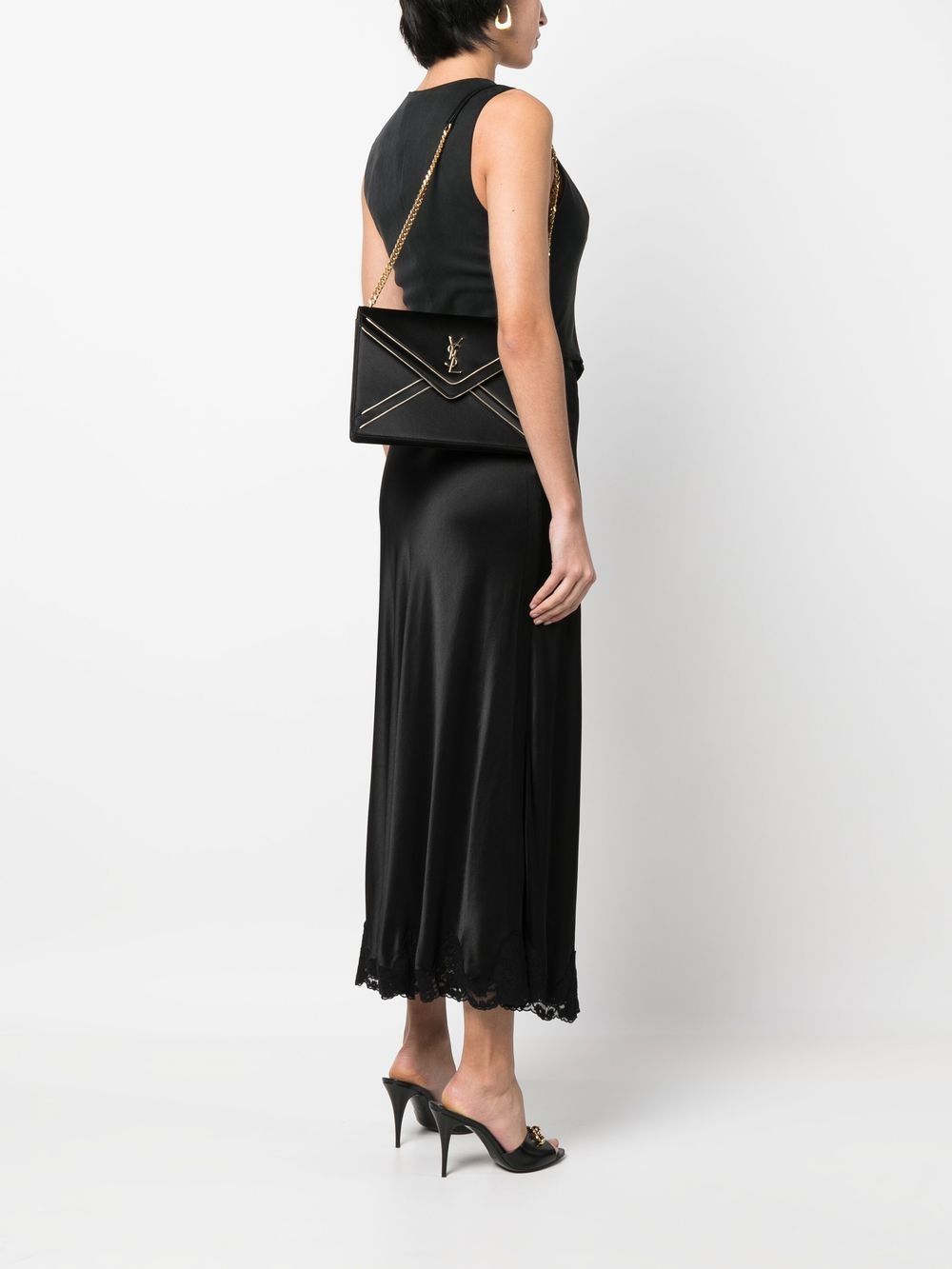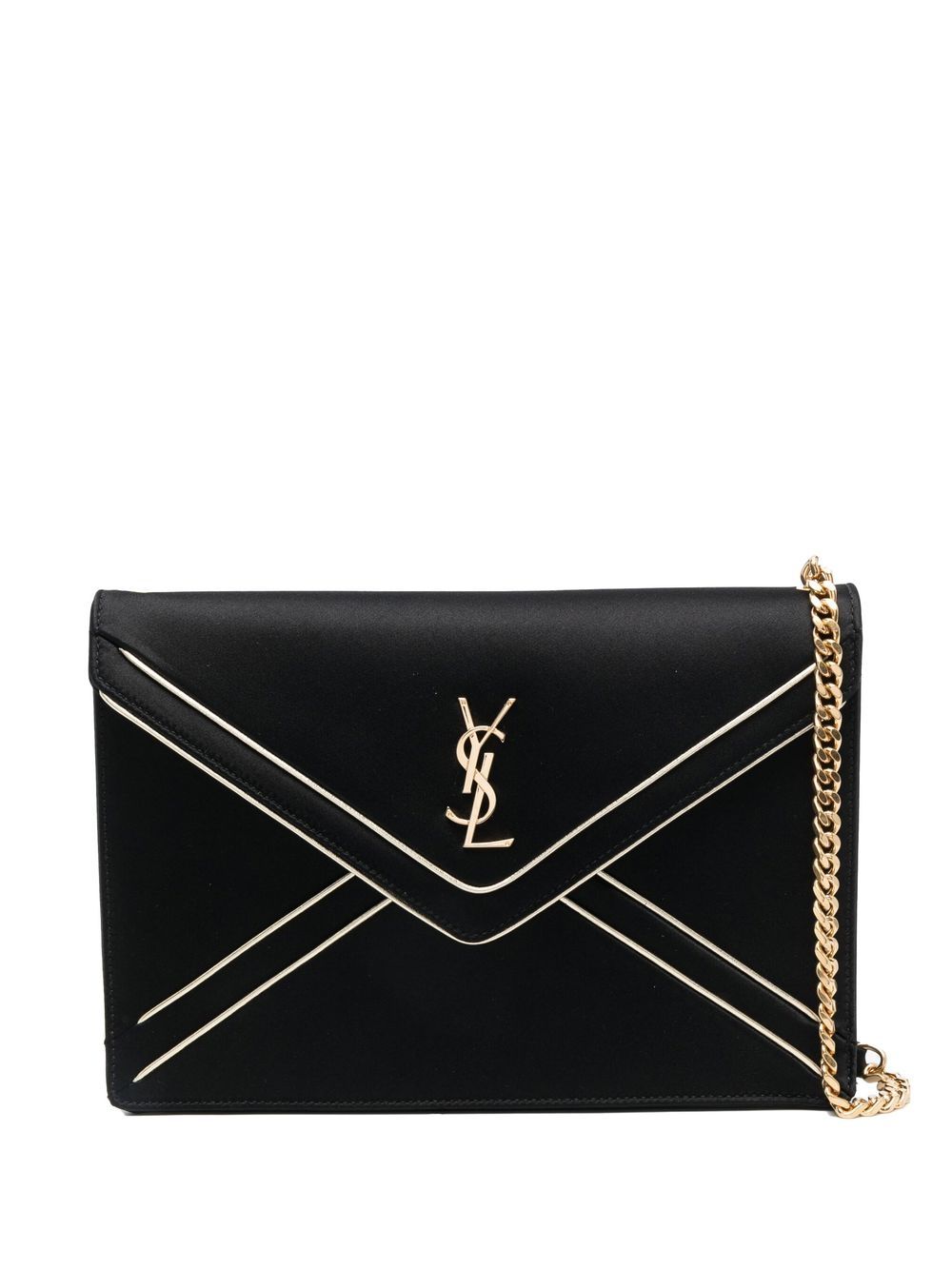 Gaby logo-plaque shoulder bag from SAINT LAURENT featuring black, calf leather, satin weave, gold-tone hardware, piped-trim detailing, signature YSL logo plaque, internal logo patch, detachable chain-link shoulder strap, foldover top with magnetic fastening, main compartment, internal zip-fastening pocket and slip pocket to the rear.