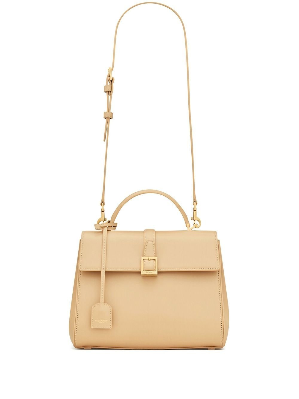 Joan small leather bag from SAINT LAURENT featuring beige, calf leather, gold-tone hardware, leather tag, foldover top with magnetic fastening, adjustable shoulder strap, single rounded top handle and main compartment.