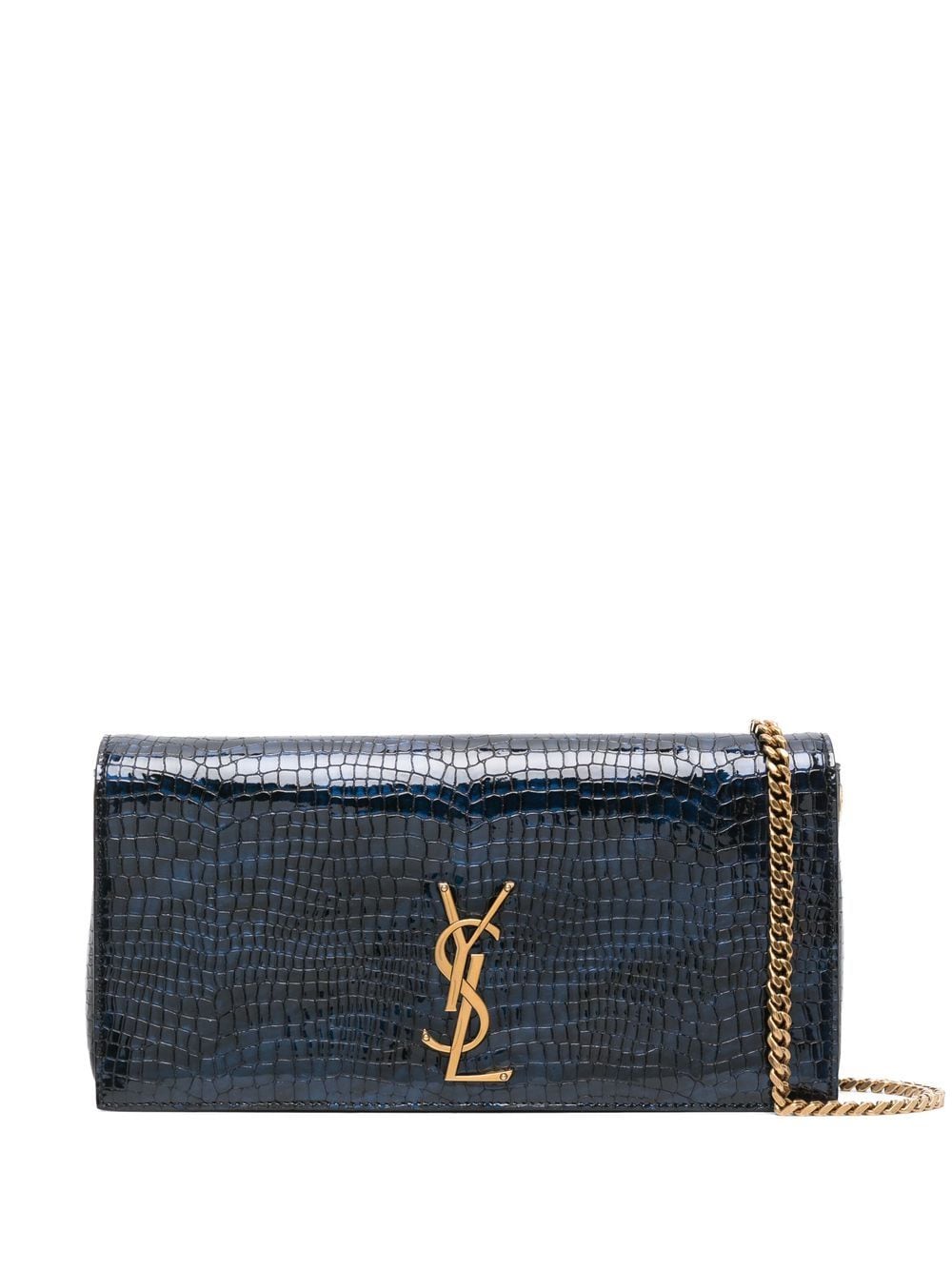 • Saint Laurent introduces the iconic Kate bag in an embossed-crocodile texture for added interest. The focal point of the piece is the signature YSL plaque, presented in a classic gold tone.