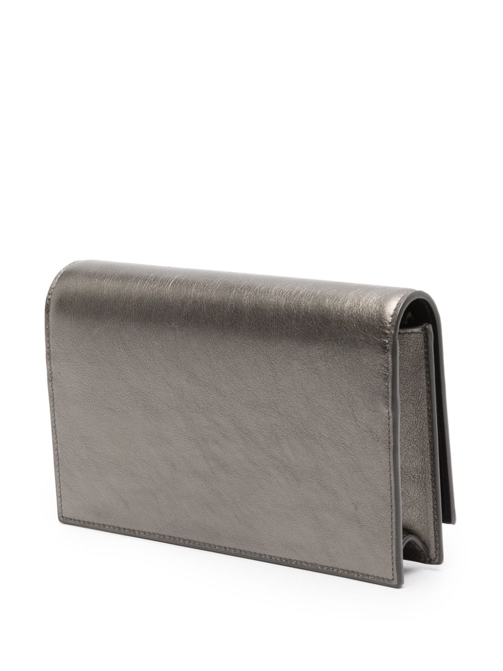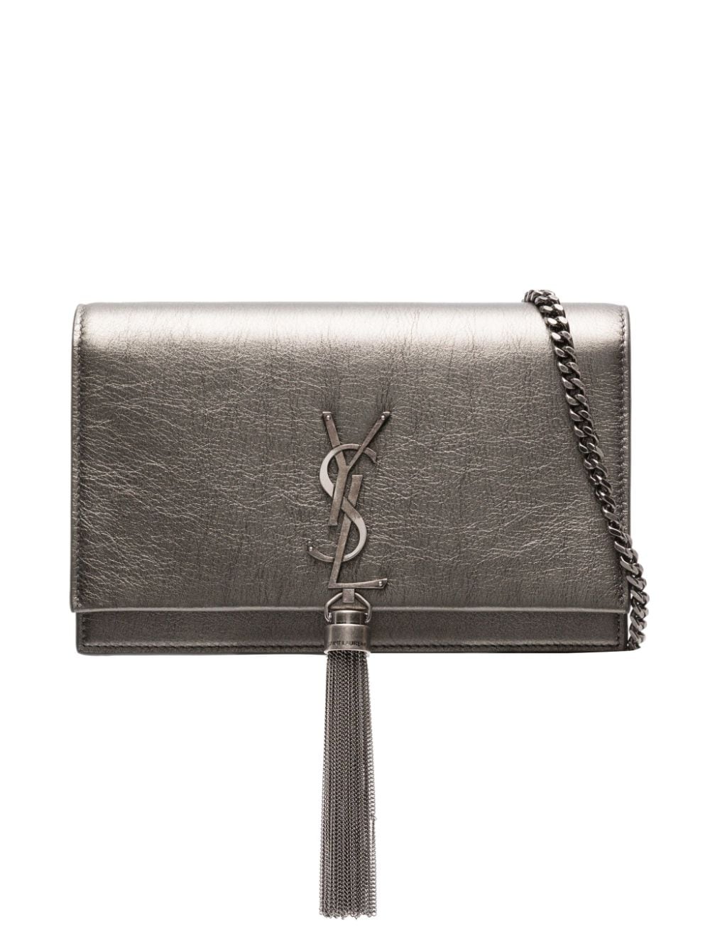This iteration of the Saint Laurent Kate bag boasts a metallic finish. While the leather construction boasts a Silver Coal hue, the classic silhouette is embellished with a matching monogram plaque and tassel detail for a classic branded touch.