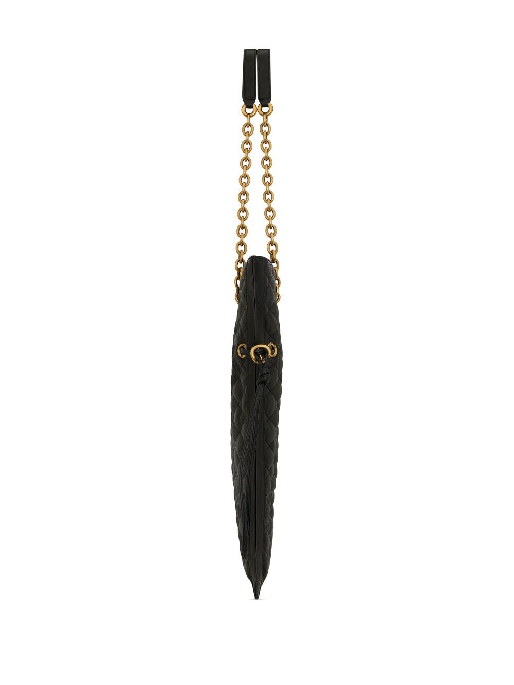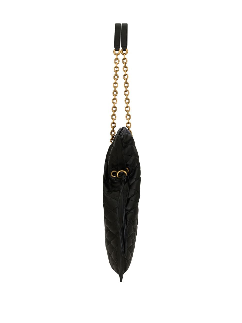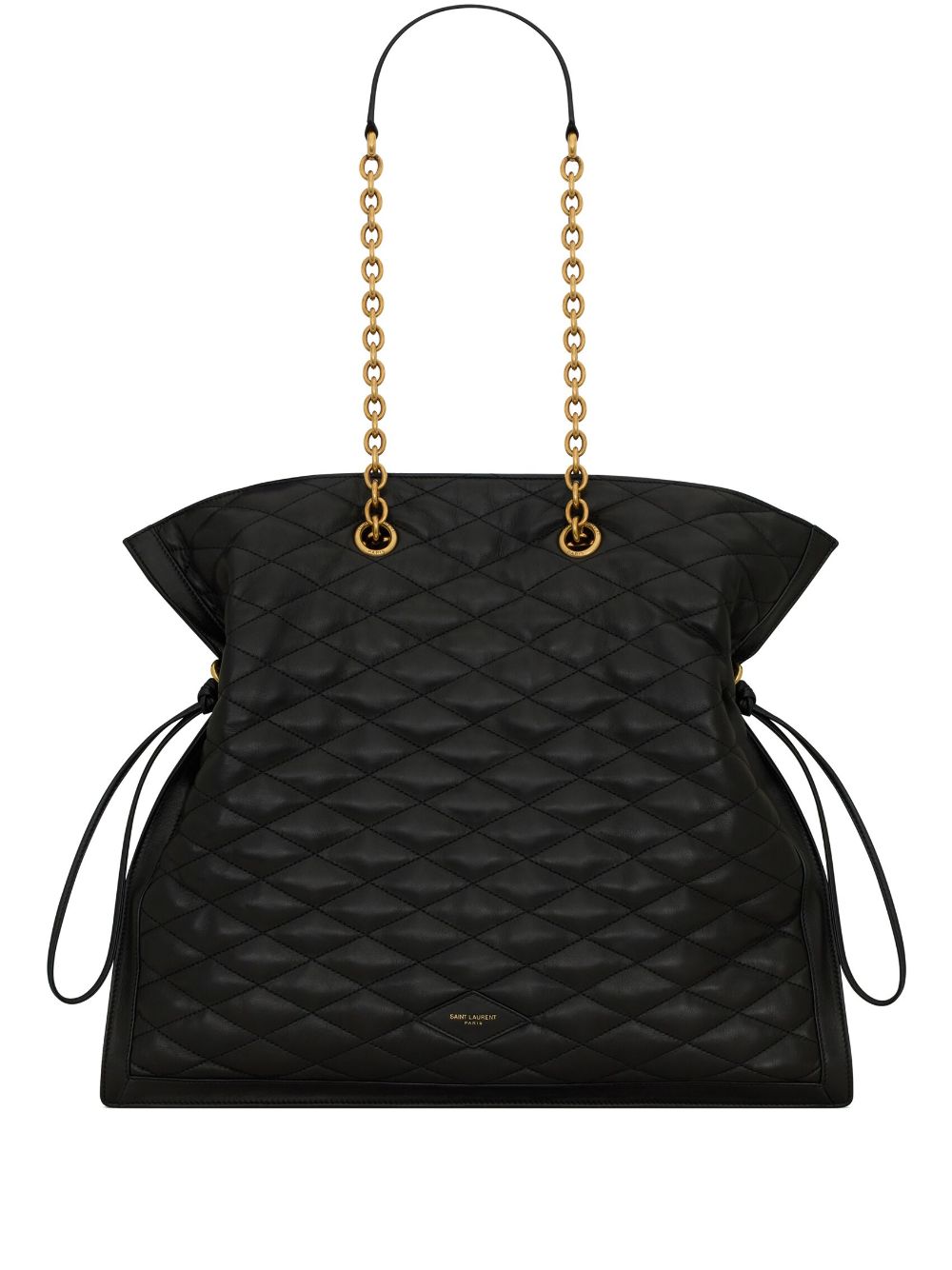 • SAINT LAURENT’s chic Parisian flair comes alive in this Le Pochon bag. It’s crafted from black quilted lambskin and features a drawstring fastening. A front gold-tone embossed logo completes the style.