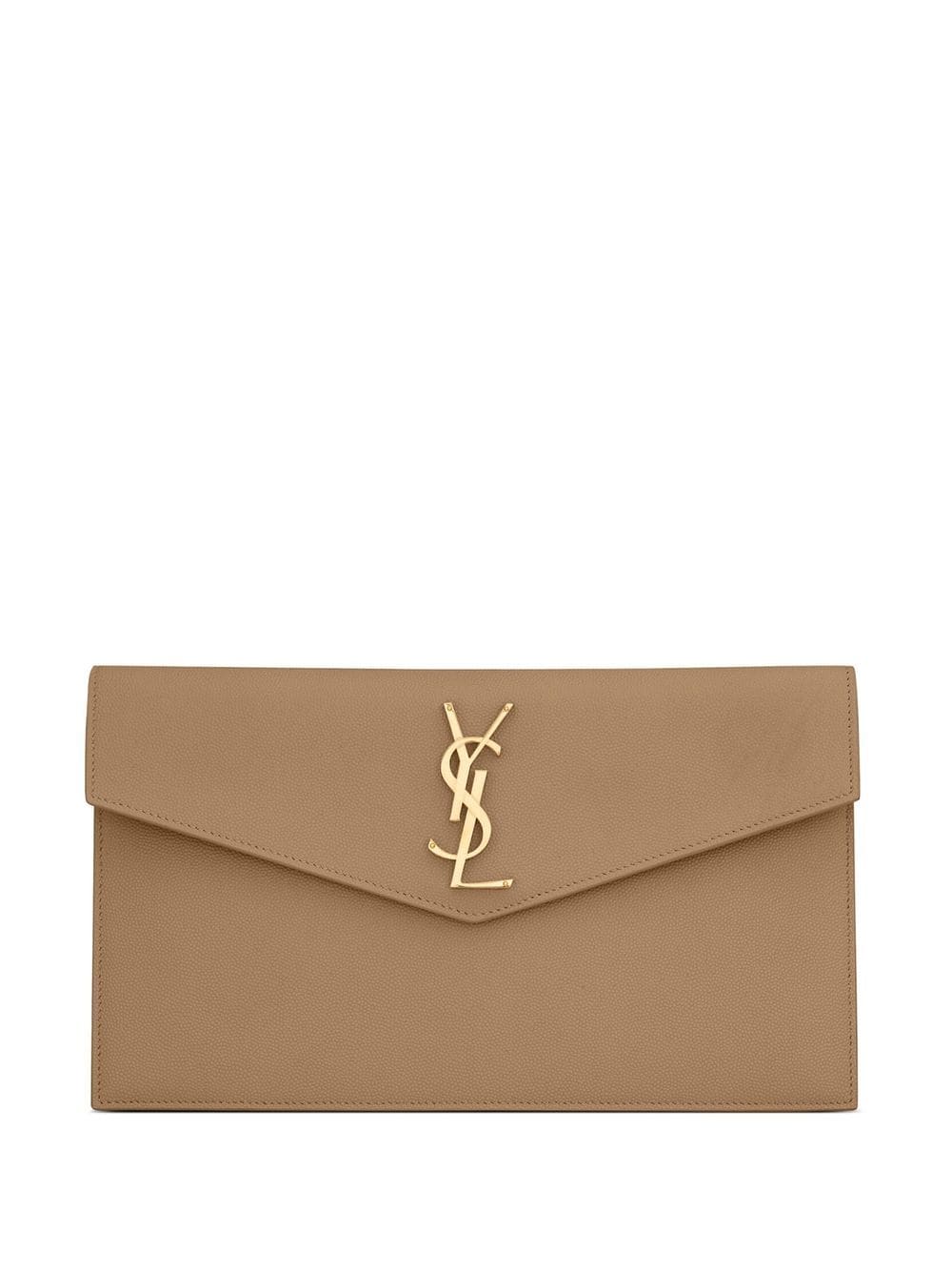 logo-lettering leather clutch bag from SAINT LAURENT featuring taupe brown, calf leather, foldover top, magnetic fastening and main compartment.