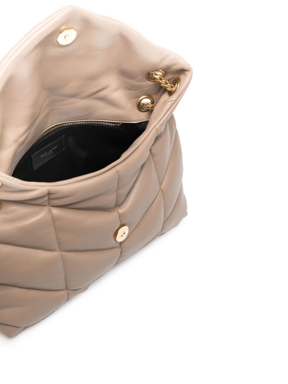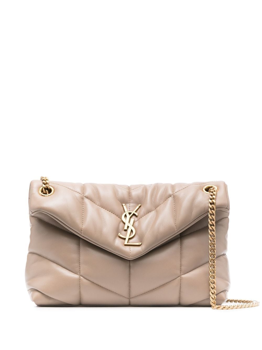 Dusty grey leather logo-plaque shoulder bag from SAINT LAURENT featuring chevron quilting, signature YSL logo plaque, gold-tone hardware, foldover top with magnetic fastening, internal zip pocket and adjustable leather and chain-link shoulder strap.