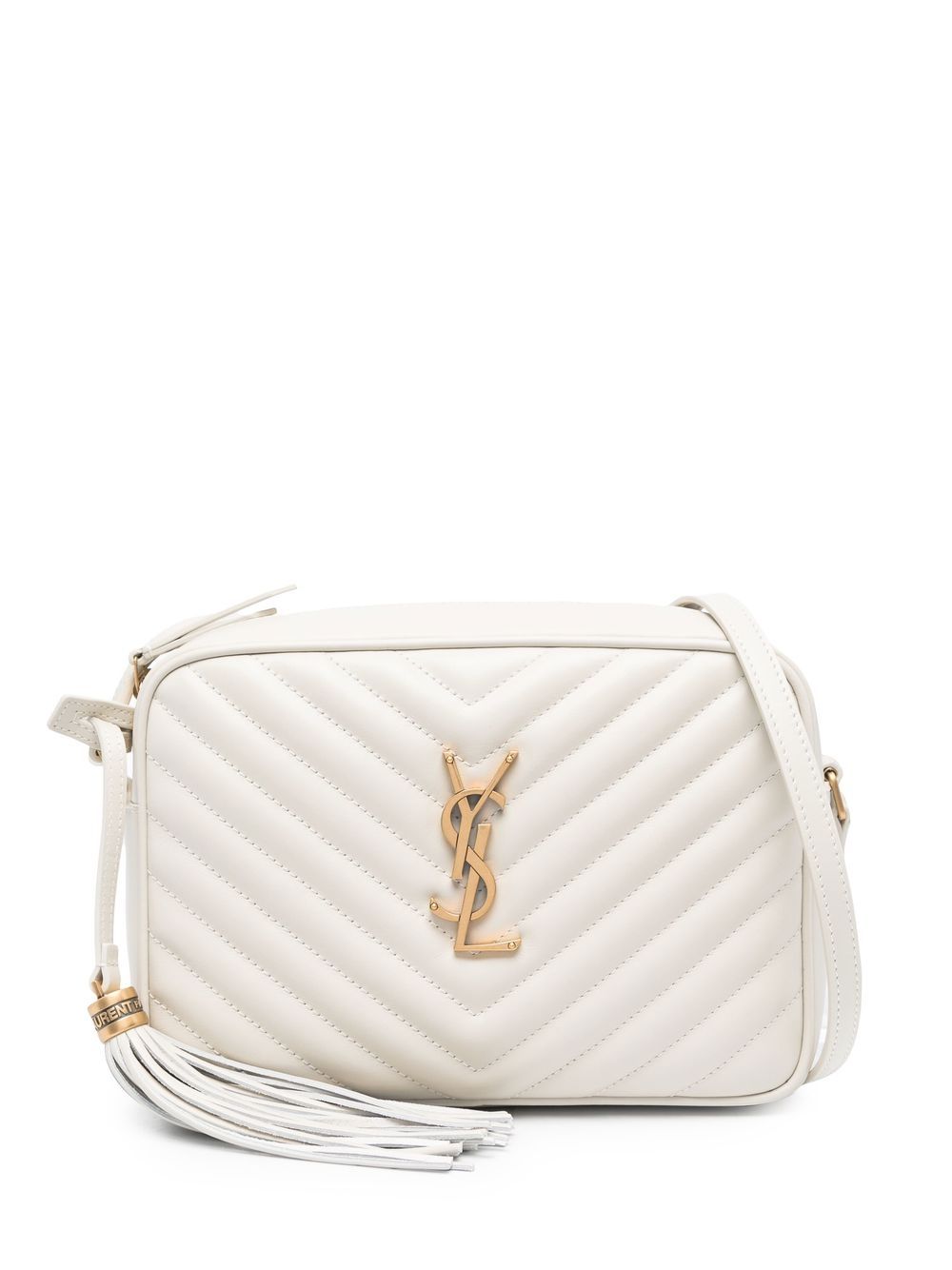 • Saint Laurent updates its Lou camera bag each season with distinct hues and finishes. Reinvented with a white quilted leather construction, this iteration features the label’s signature gold-tone YSL plaque and tassel charm.