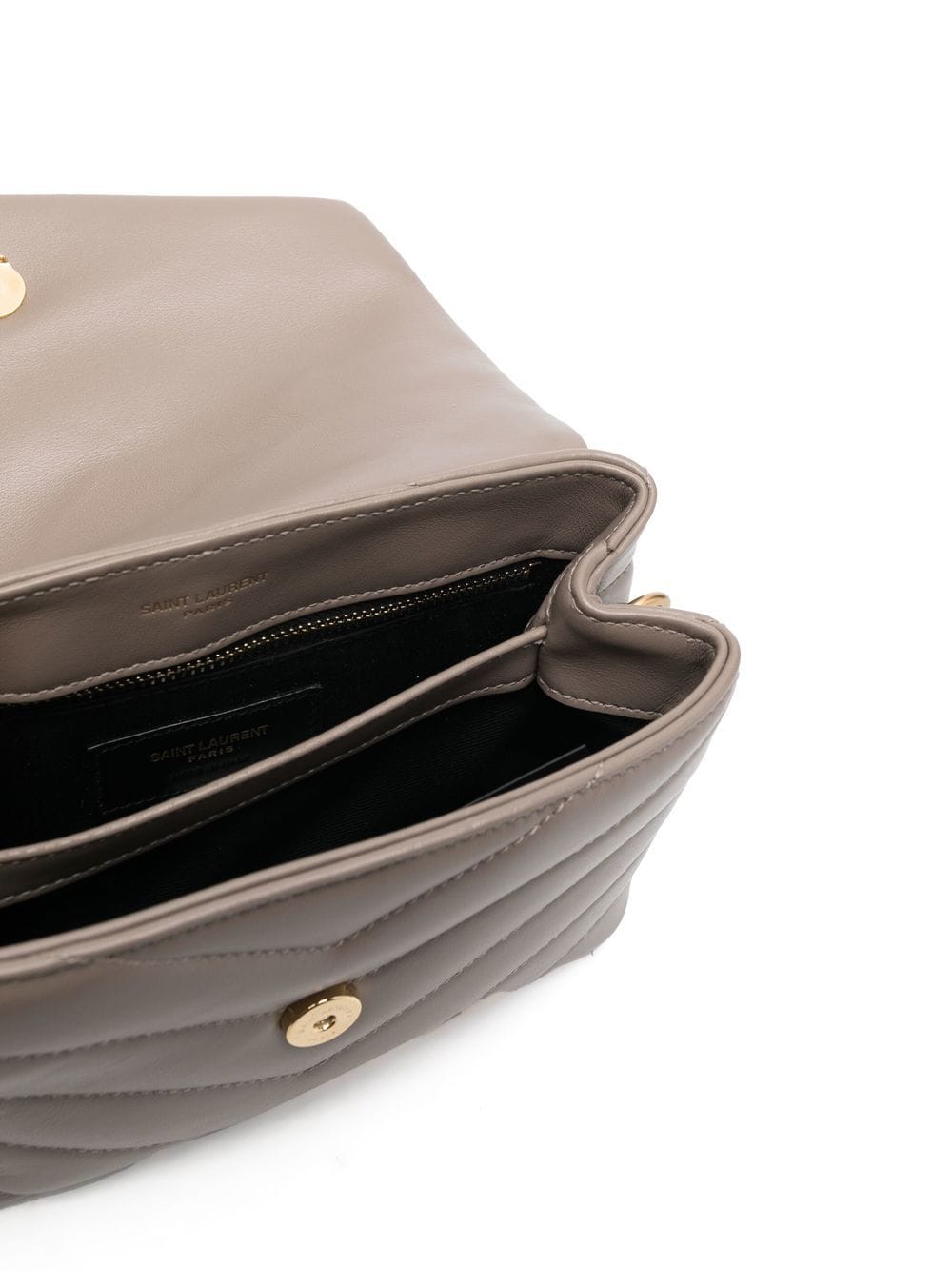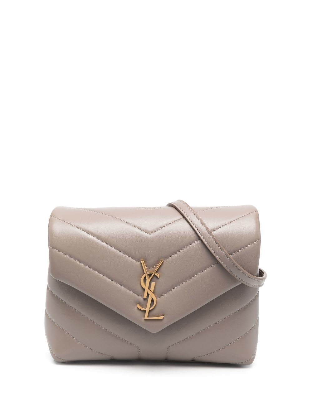 • Loulou monogram crossbody bag from SAINT LAURENT featuring quilted finish, signature YSL logo plaque, foldover top with magnetic fastening, adjustable shoulder strap, light grey and calf leather.