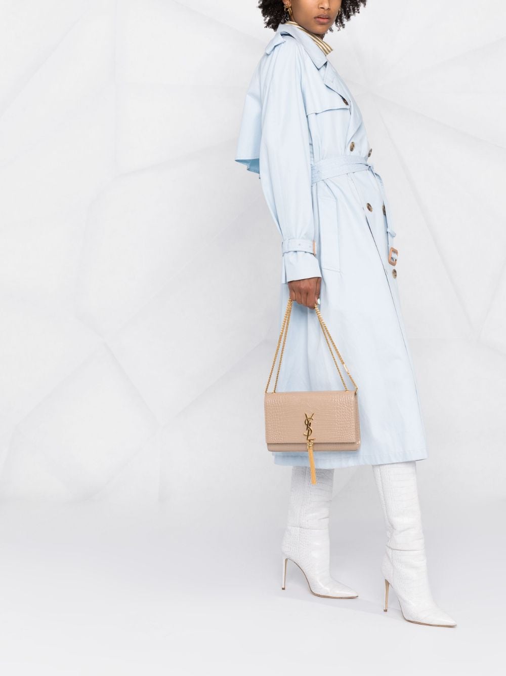 Once under the name Yves Saint Laurent, the Saint Laurent brand has retained its instantly recognisable YSL monogram. The Kate shoulder bag showcases it as a plaque atop a textured crocodile-effect backdrop.