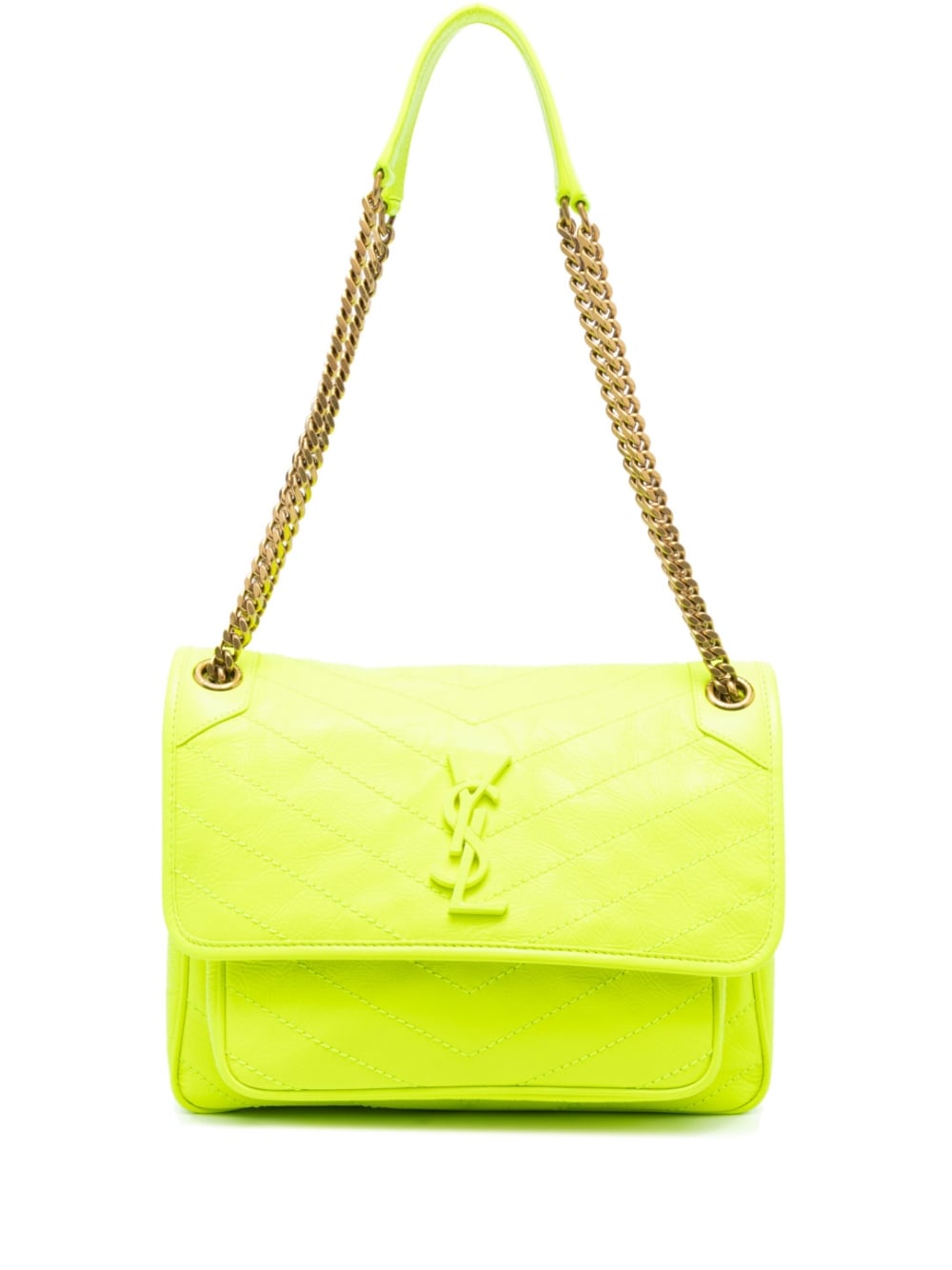 Saint Laurent puts a vivid spin on its iconic Niki shoulder bag for SS23. Crafted from leather, this medium iteration is rendered in a neon-yellow hue and topped with a coordinating YSL logo plaque.