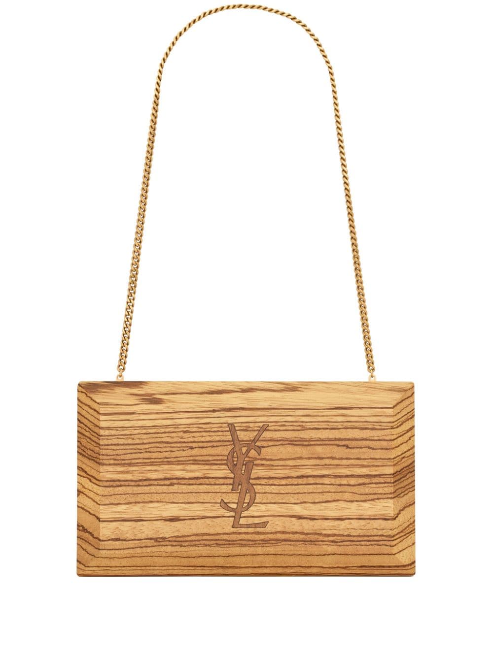 This Saint Laurent Minaudiere bag is unique for its natural wood construction – even the signature YSL logo is inset at the front in a contrasting grain. The structural and compact silhouette is carved with angular edges and lined with smooth leather.