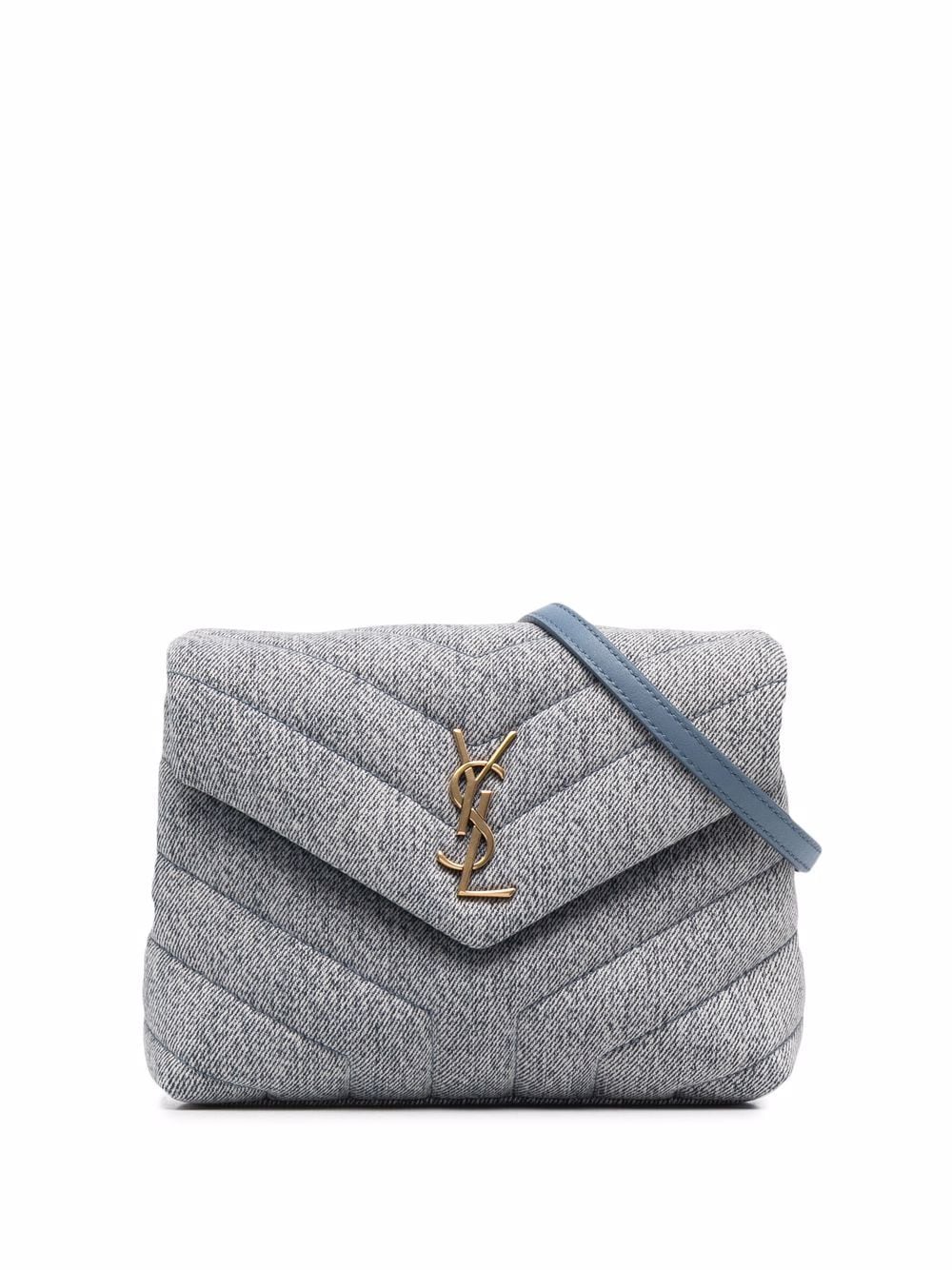 Blue Mono denim mini bag from SAINT LAURENT featuring quilted, signature YSL logo plaque, foldover top with magnetic fastening, partitioned compartment and adjustable detachable shoulder strap.