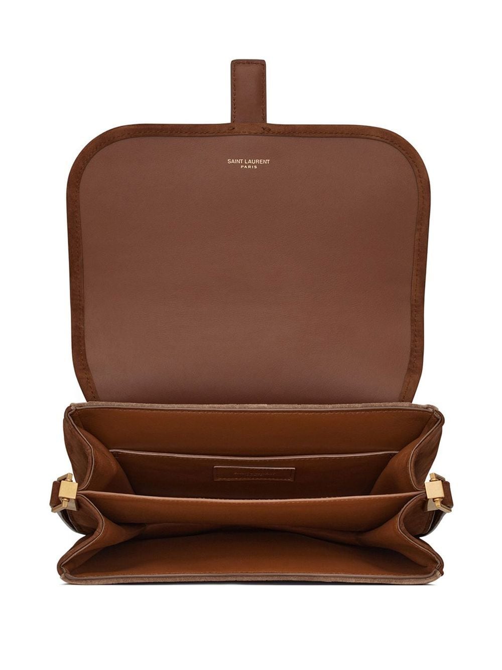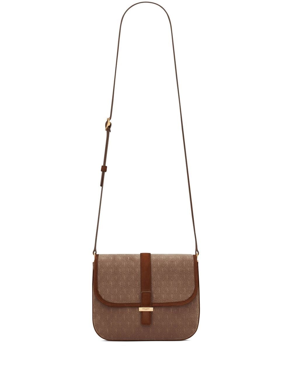 monogram crossbody bag from SAINT LAURENT featuring cognac brown, leather, debossed monogram pattern, panelled design, foldover top, adjustable shoulder strap and main compartment.