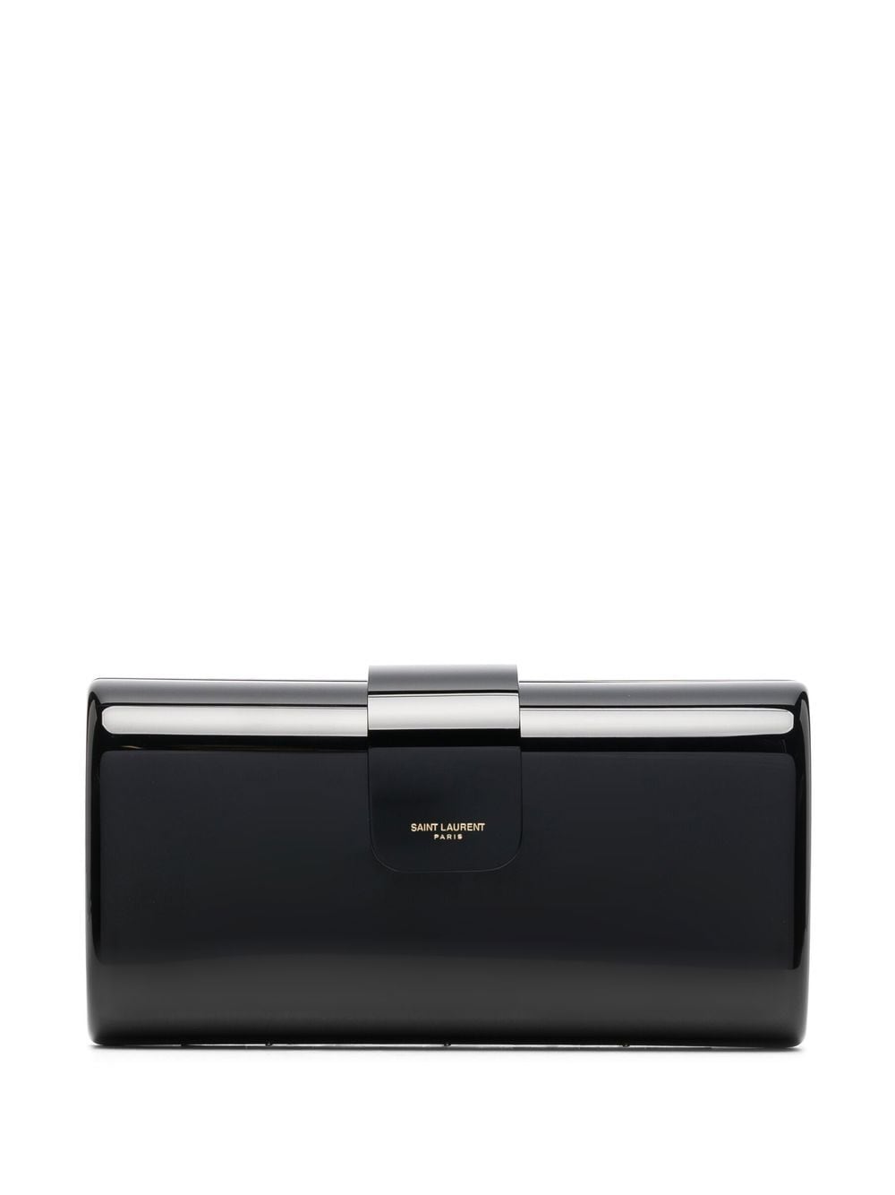 patent box clutch bag from SAINT LAURENT featuring black, patent finish, logo stamp to the front, foldover top and internal slip pocket.