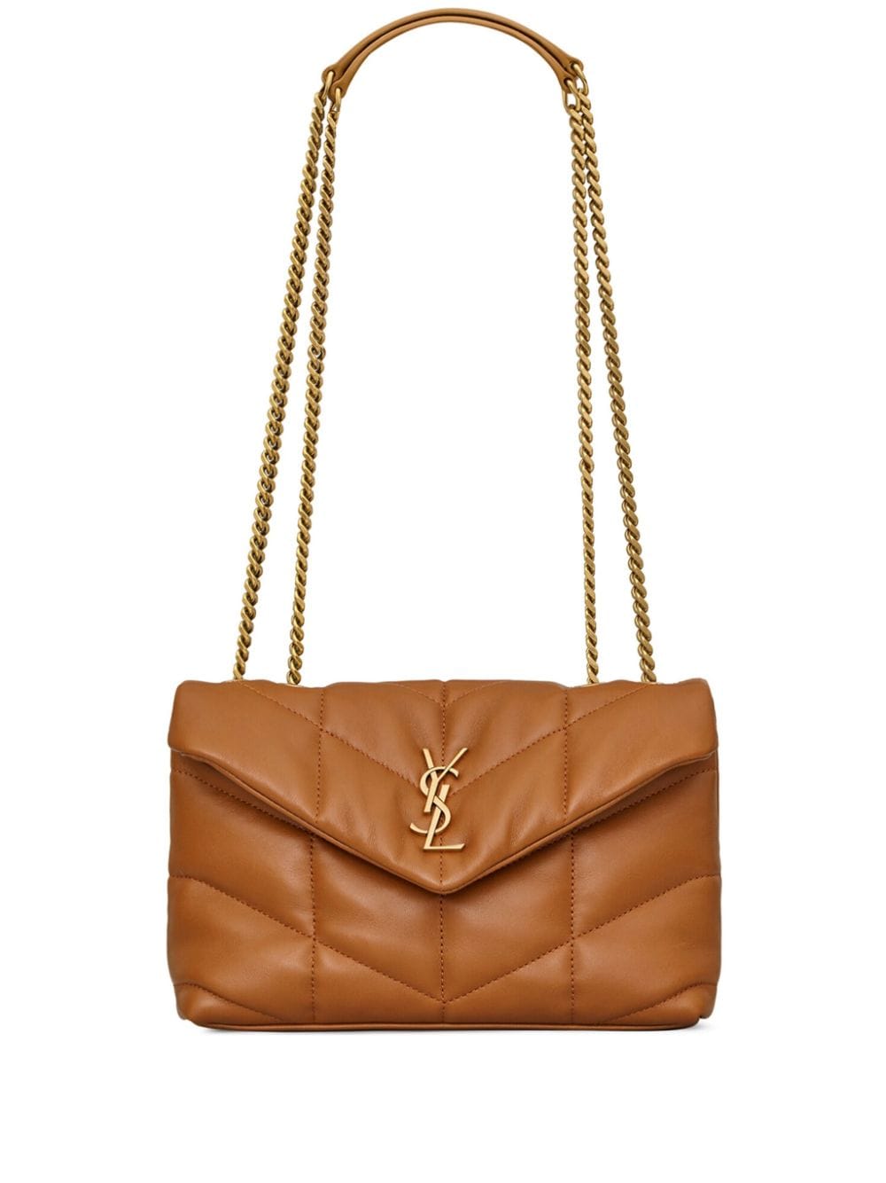 In Saint Laurent’s signature sleek aesthetic, the Puffer Toy bag is crafted from soft leather. The look-defining quilted design is embellished with a gold-tone logo plaque for a sophisticated branded touch while a matching chain link strap cements the bag’s tasteful appeal.