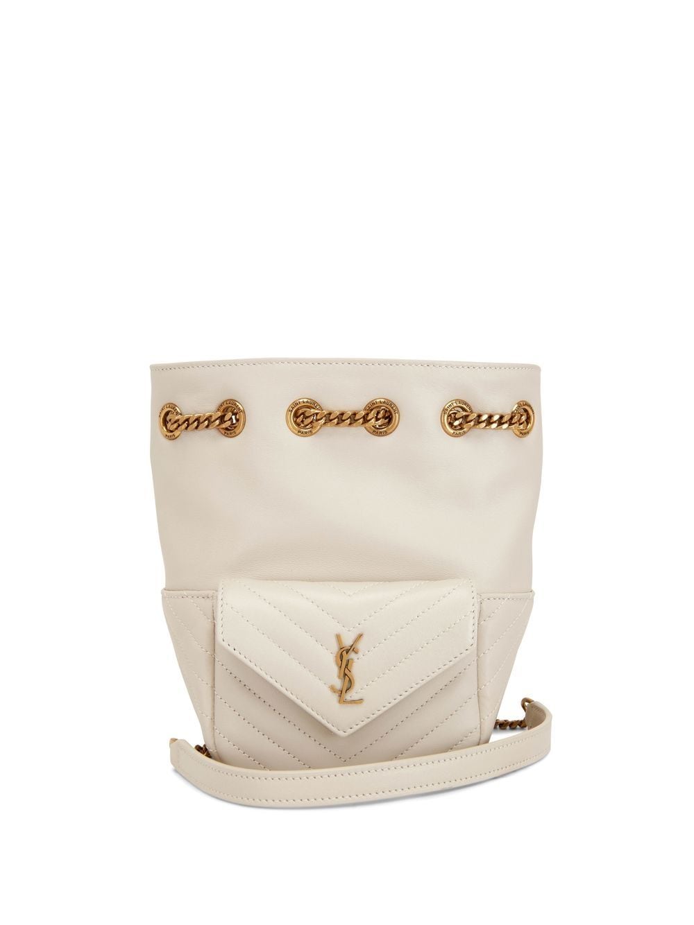 quilted leather bucket bag from SAINT LAURENT featuring cream white, lambskin, gold-tone hardware, quilted panels, chain-link shoulder strap and main compartment.
